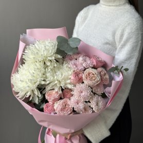 Сборный букет с сезонными хризантемами и кустовыми розами