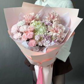 Авторский букет «Нежность рассвета» с розами и гортензией