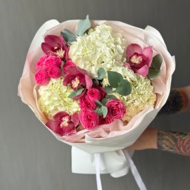 «Клубничный коктейль» орхидея с белыми гортензиями