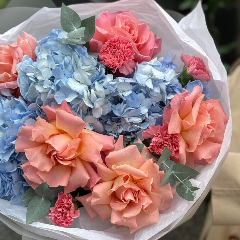 Этот букет — воплощение нежности и утонченности. В его составе гармонично сочетаются пышные голубые гортензии, символизирующие искренность и чистоту, и нежные розовые розы, олицетворяющие любовь и заботу. Яркие диантусы добавляют композиции живости и радости, а листья эвкалипта привносят свежесть и аромат природы. Букет идеально подойдет для выражения теплых чувств и создания уютной атмосферы.