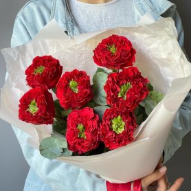 Букет пионовидная красная роза с эвкалиптом 7шт