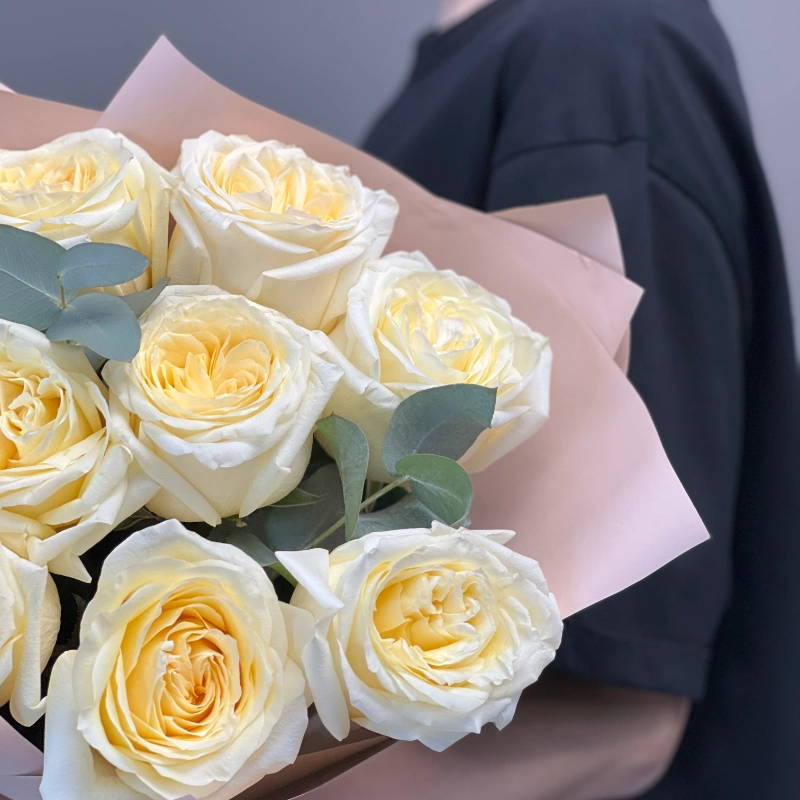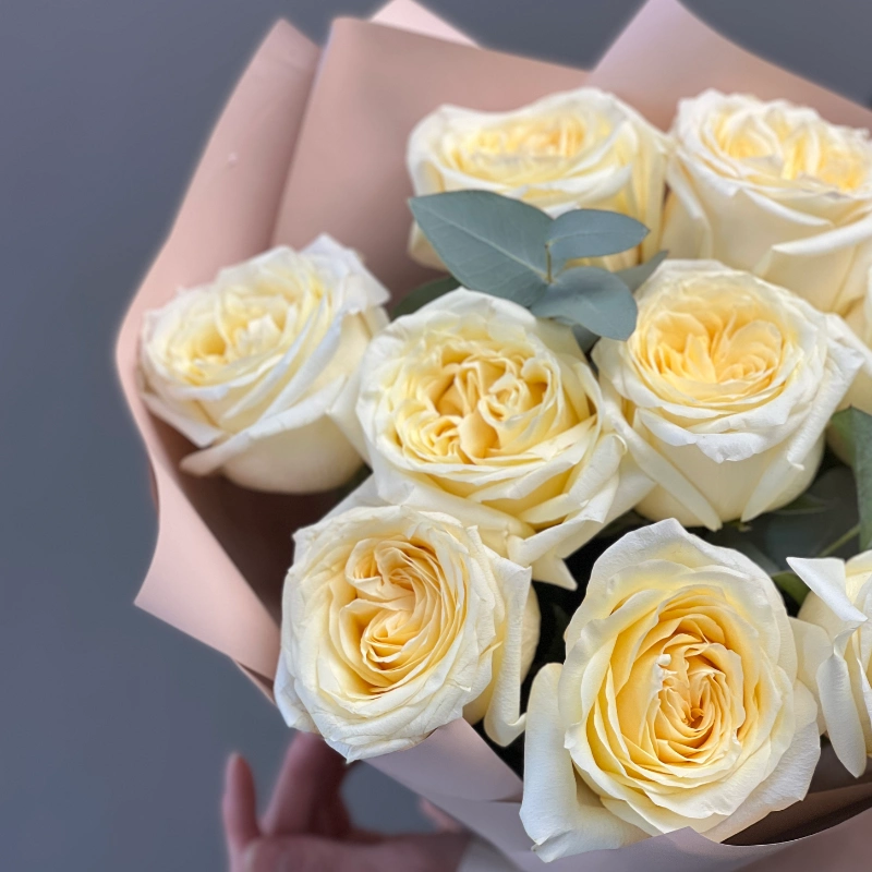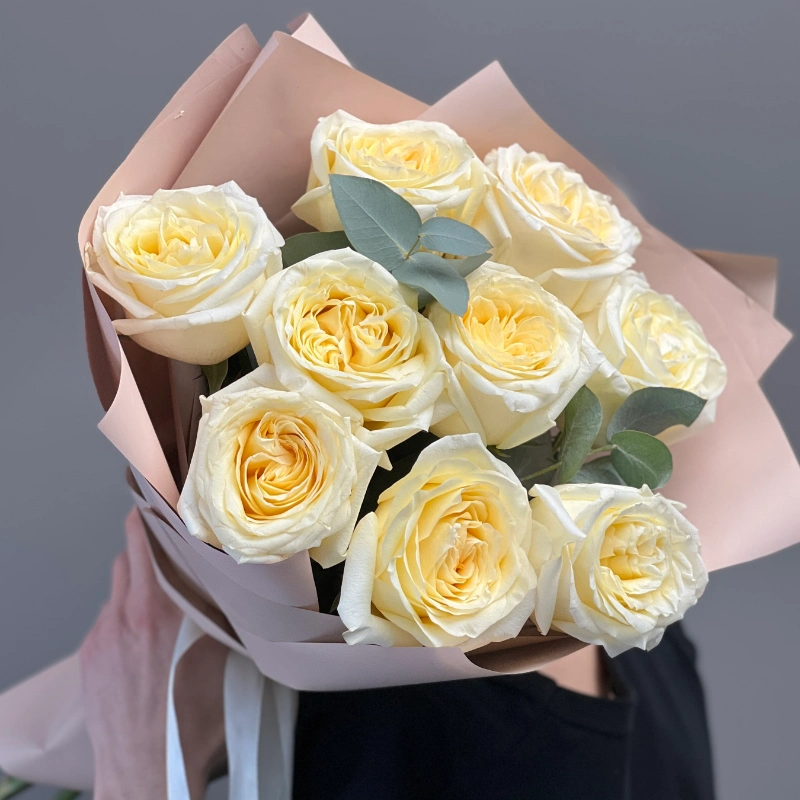 Французские розы 9шт с эвкалиптом «Аристократка»