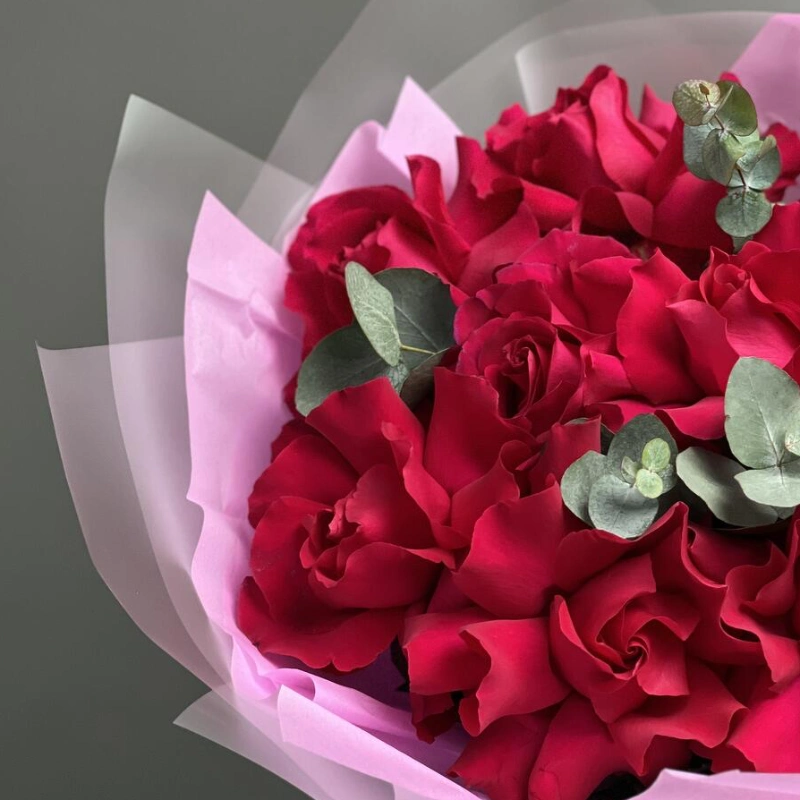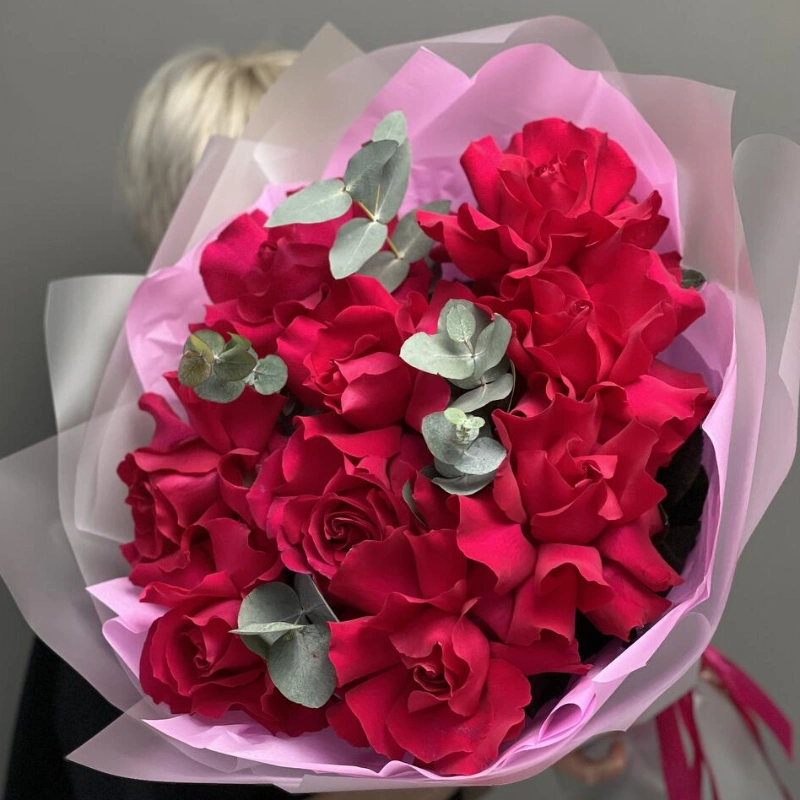 ГлавнаяКаталогРозыРозы и эвкалипт «Яркая любовь»