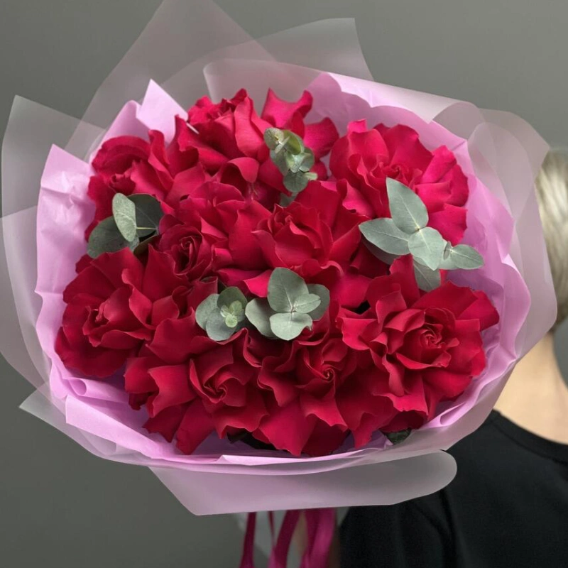 Букет кустовые розы Жизель 13 шт с эвкалиптом