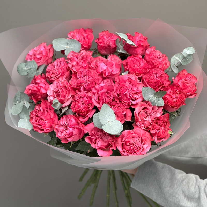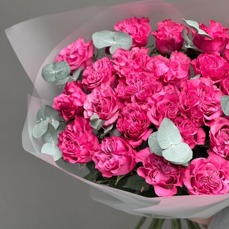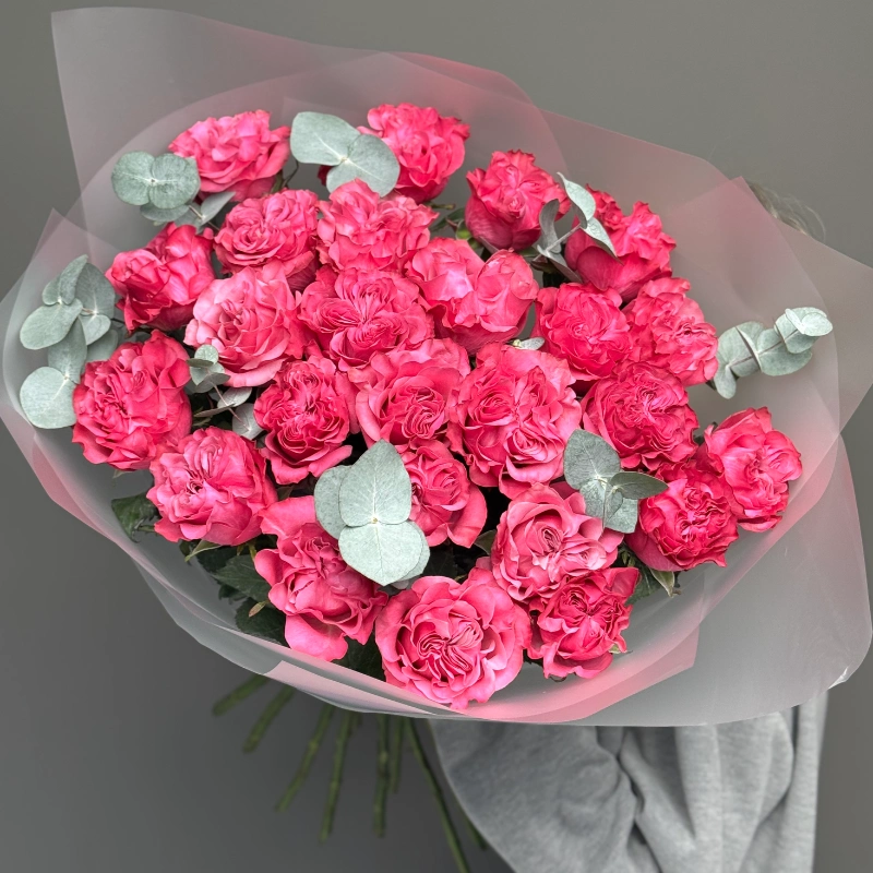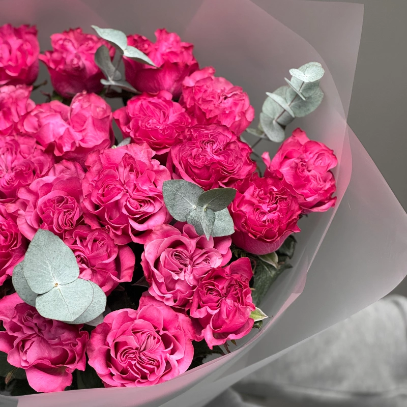 Пионовидные бантики КАНТРИ БЛЮЗ — 25 роз с эвкалиптом в фирменной упаковке. WOW эффект от подаренных роз 💕