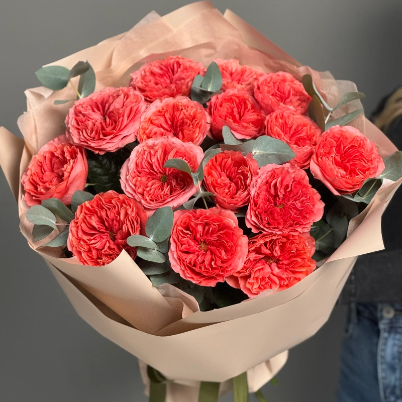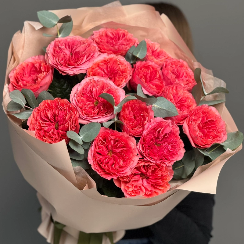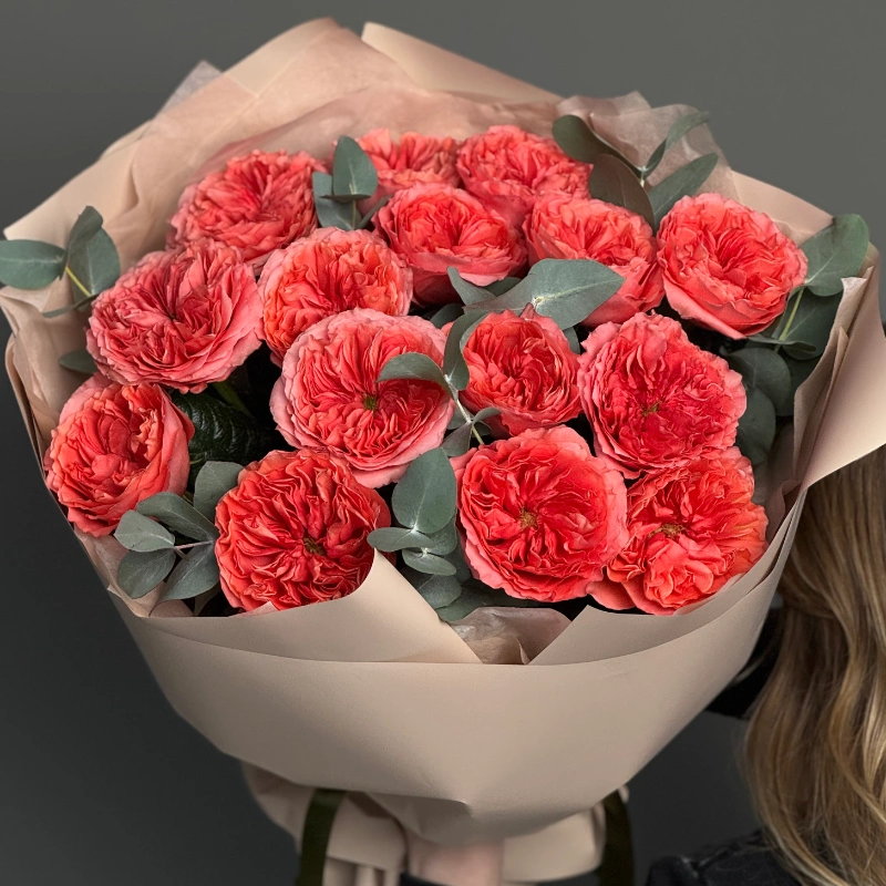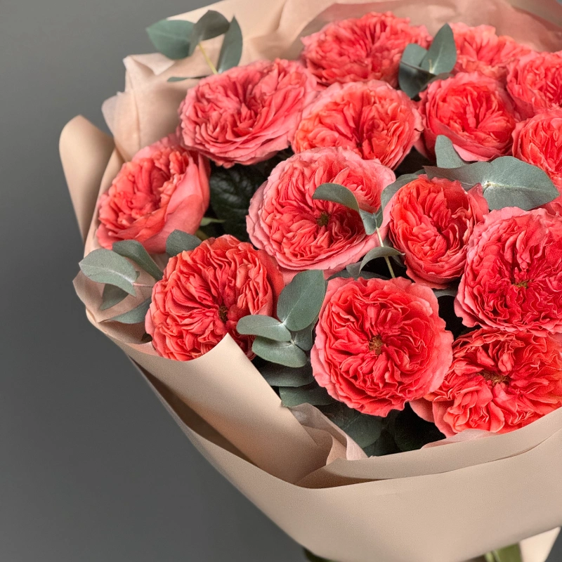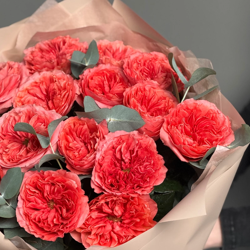 ГлавнаяКаталогРозыПионовидные розы Кенди с эвкалиптом