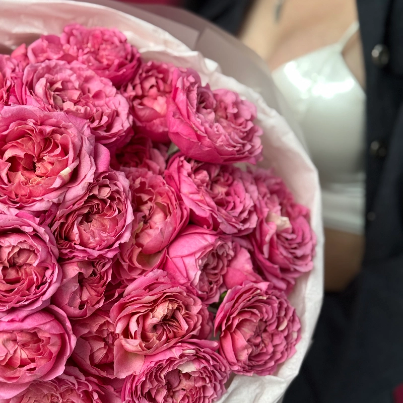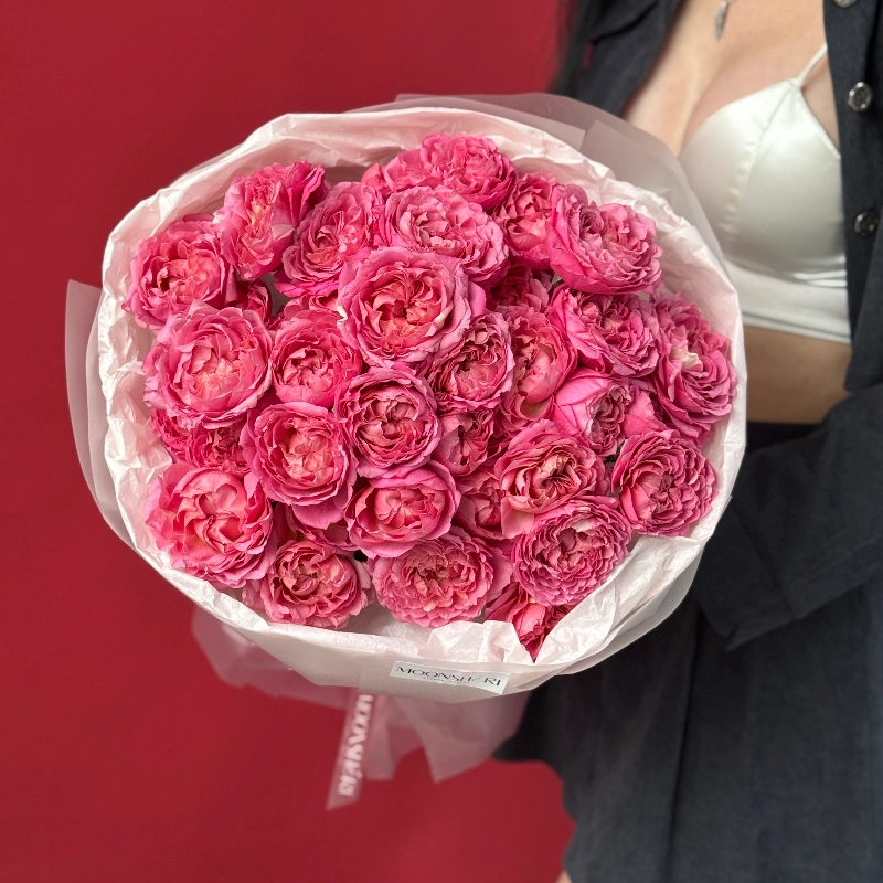 Букет из кустовых пионовидных роз — это пышный и объёмный букет с крупными насыщенными бутонами. Он подойдёт для любого случая и не требует дополнительных украшений.