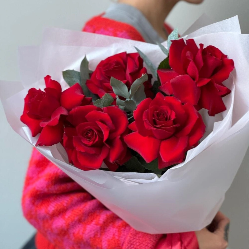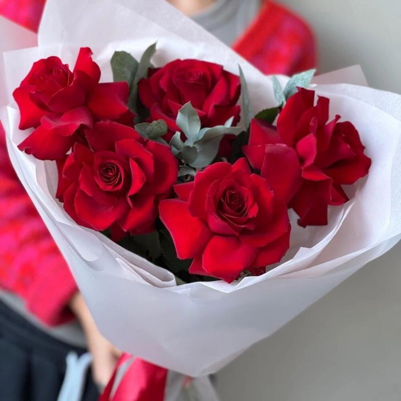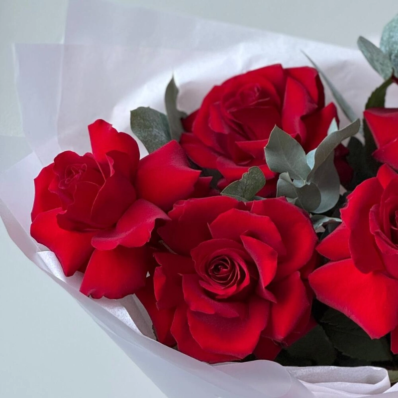 ГлавнаяКаталогРозыФранцузские красные розы с эвкалиптом