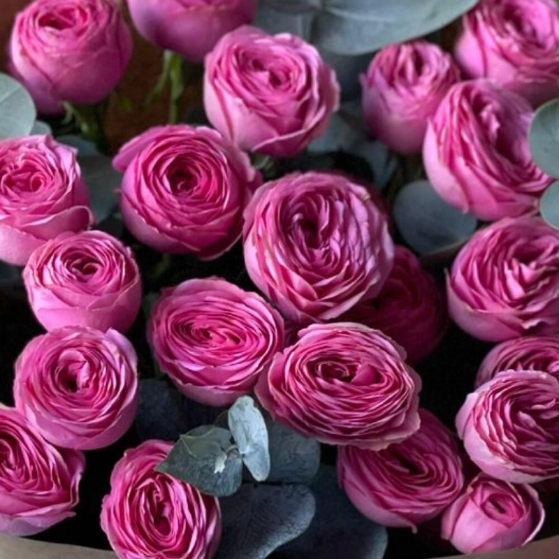 ГлавнаяКаталогРозыМоно букет кустовые розы фуксия 7шт с эвкалиптом