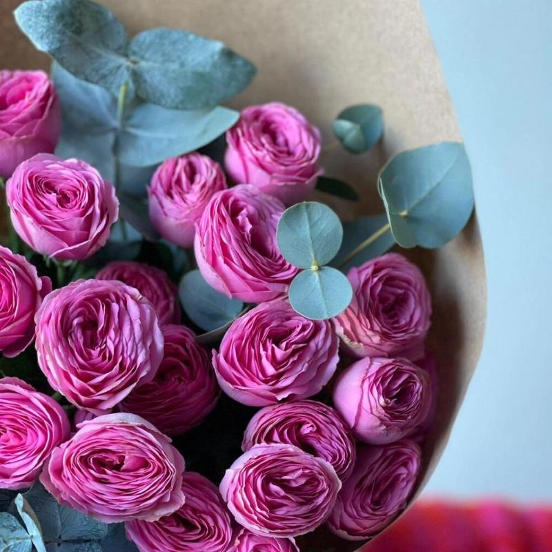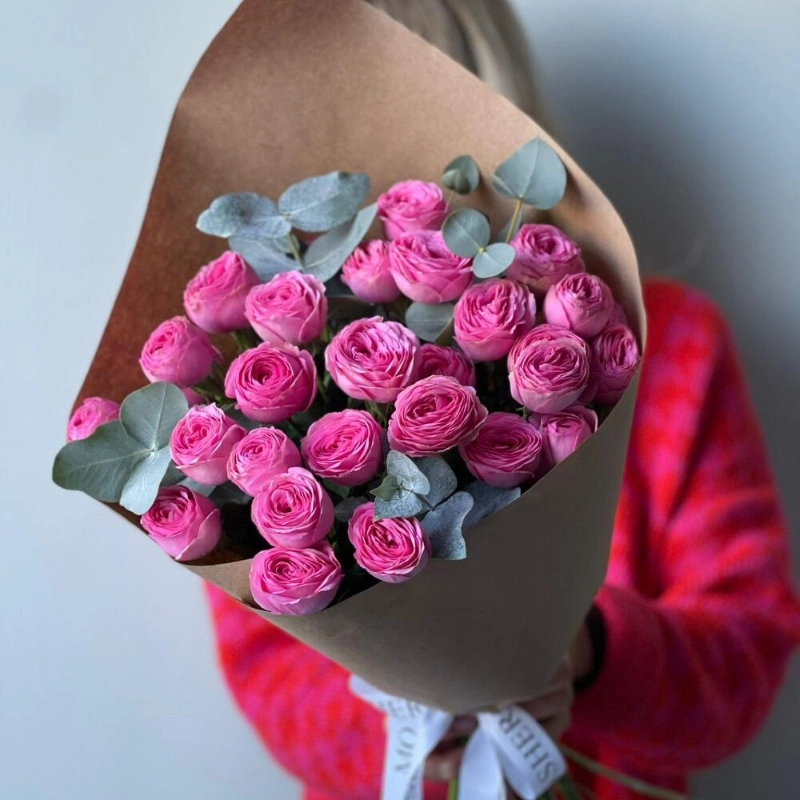Моно букет кустовые розы фуксия 7шт с эвкалиптом