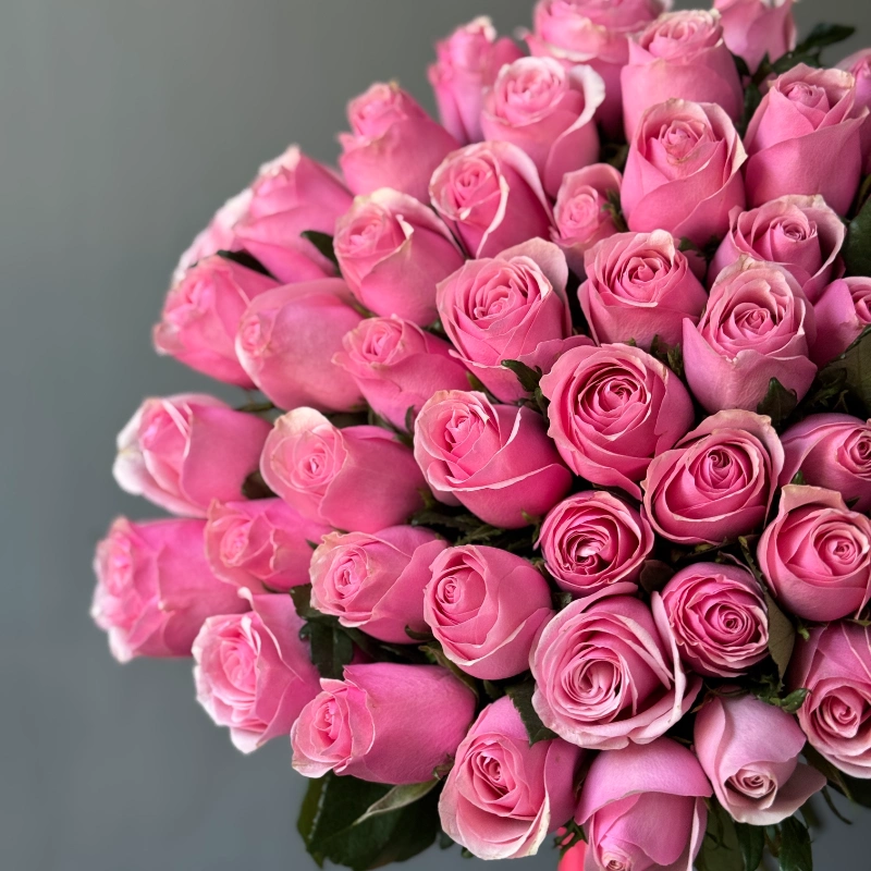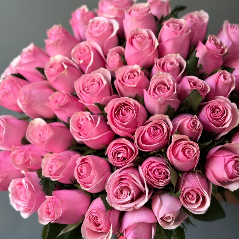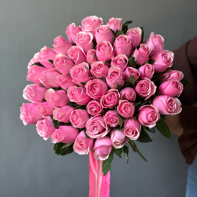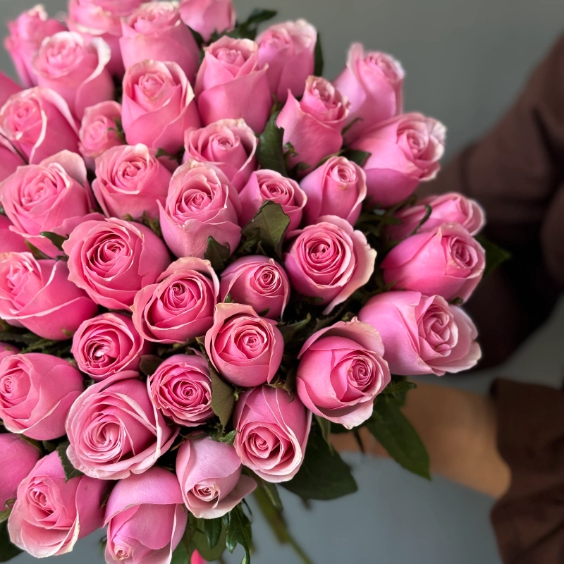 Моно букет кустовые розы фуксия 7шт с эвкалиптом