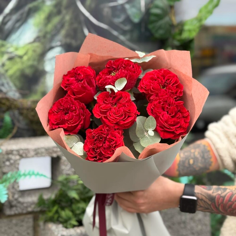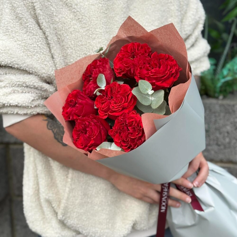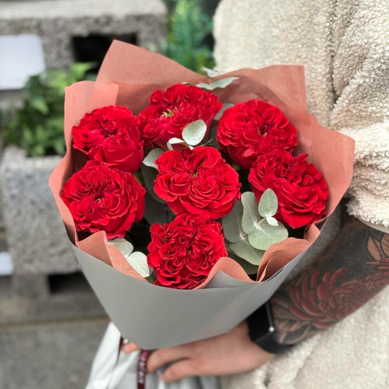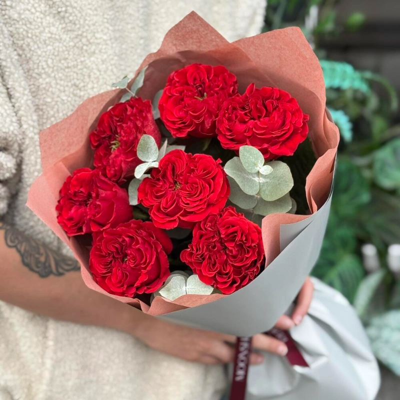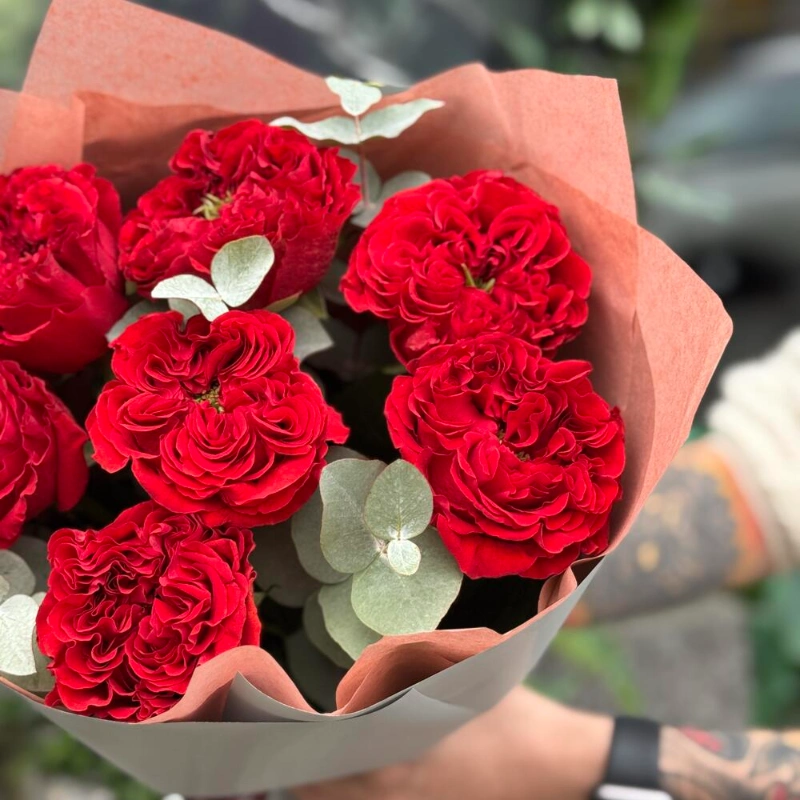 Букет пионовидная красная роза с эвкалиптом 7шт