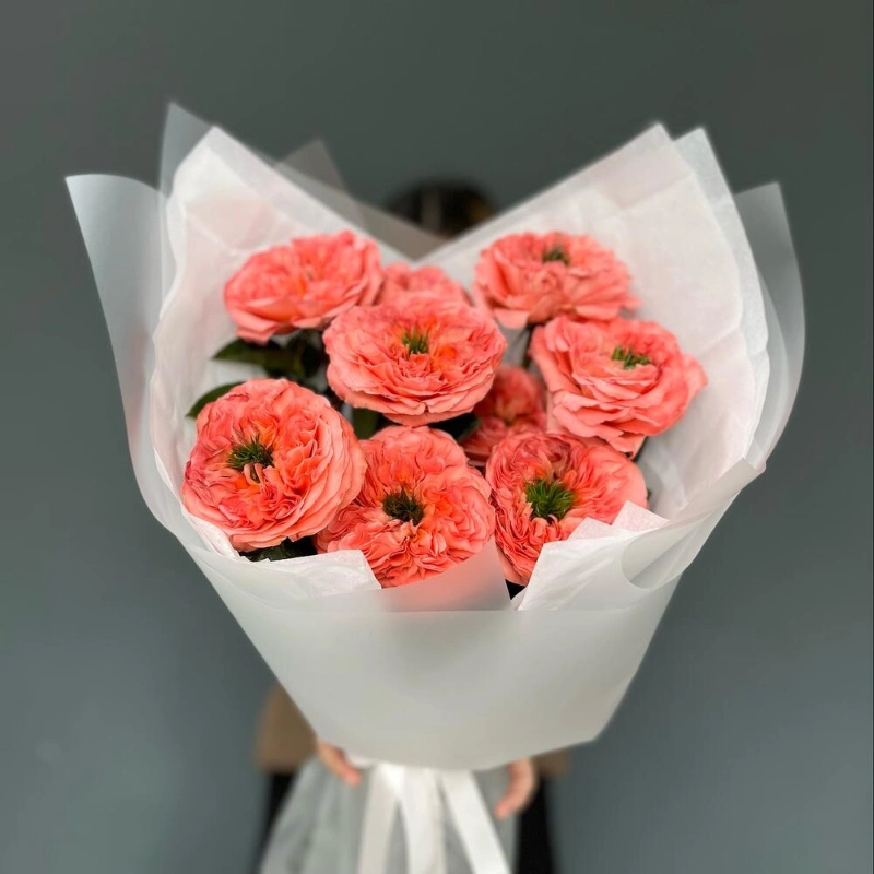 ГлавнаяКаталогРозыБукет пионовидная роза мандарин 9шт