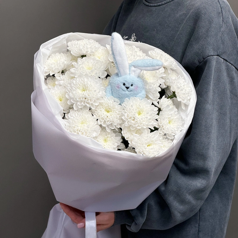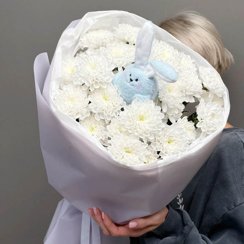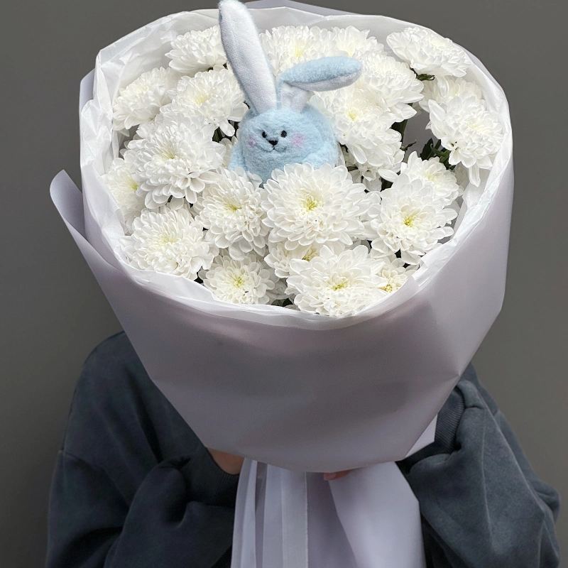 Очень милый букет из нежных стойких кустовых хризантем Алтай с очаровательным зайчиком. Букет упакован в стильную матовую пленку с белым тишью.