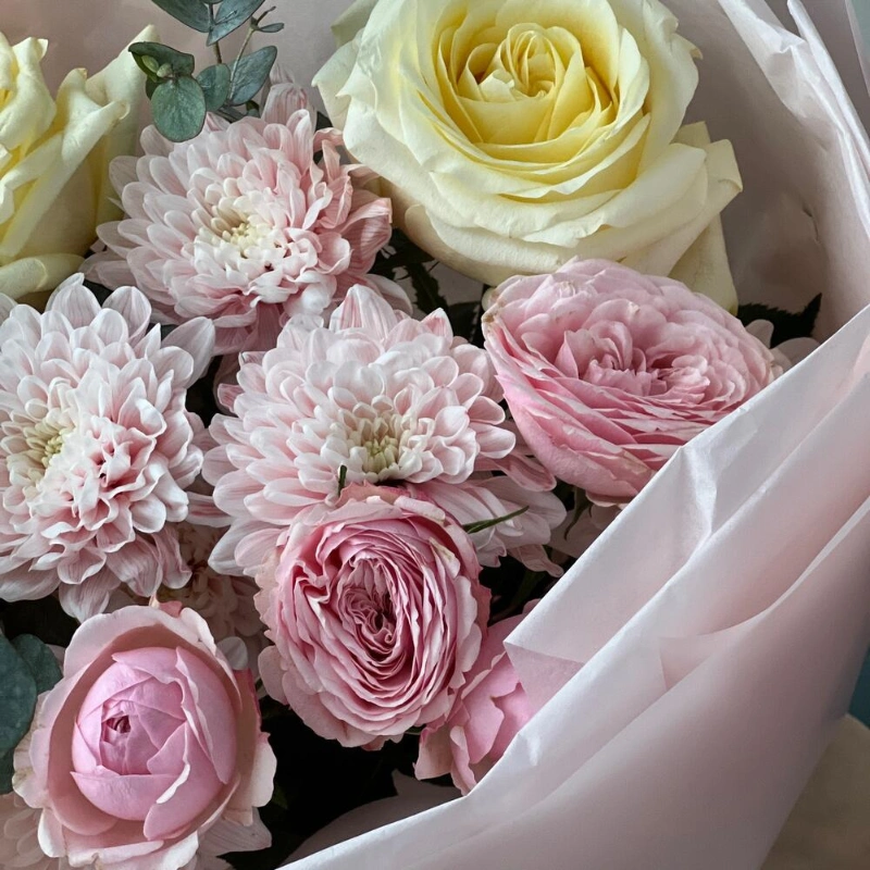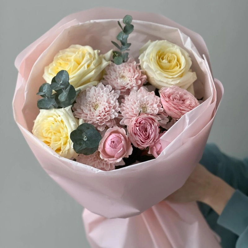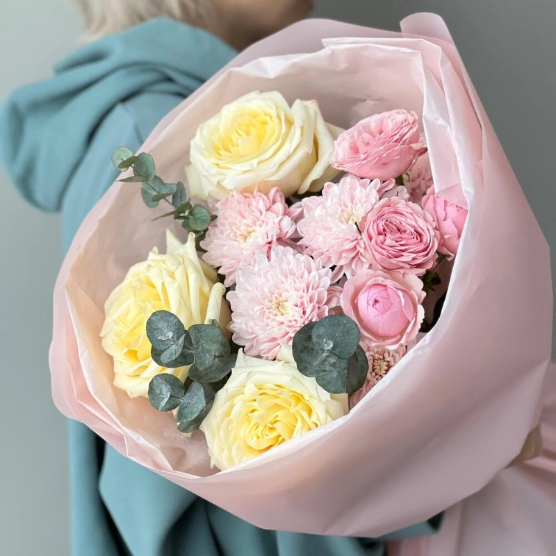 Букет исполнен из стойких нежных цветов, будет долго радовать получателя! Нежные оттенки, разные фактуры, стильный эвкалипт