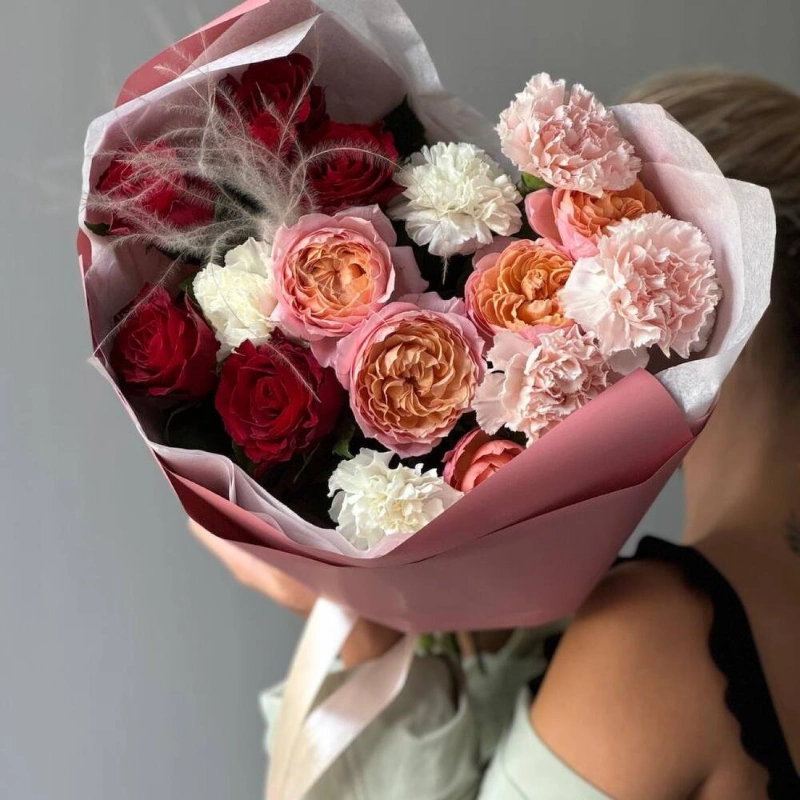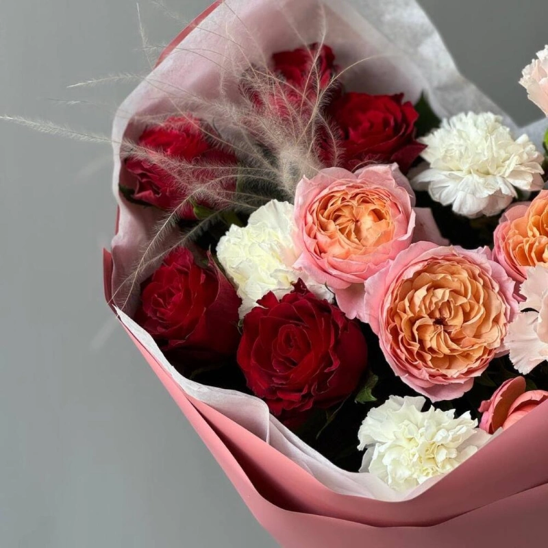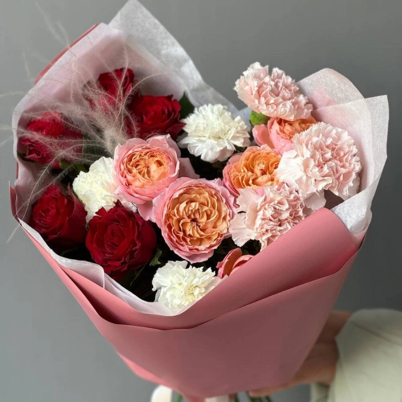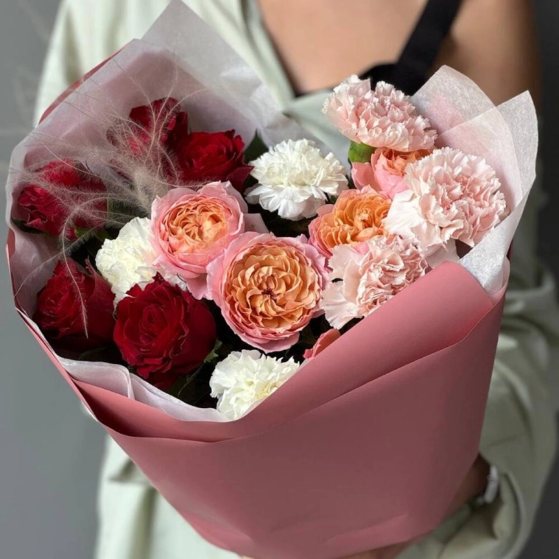 Яркий букет из кустовой и одноголовой розы с добавлением диантусов
