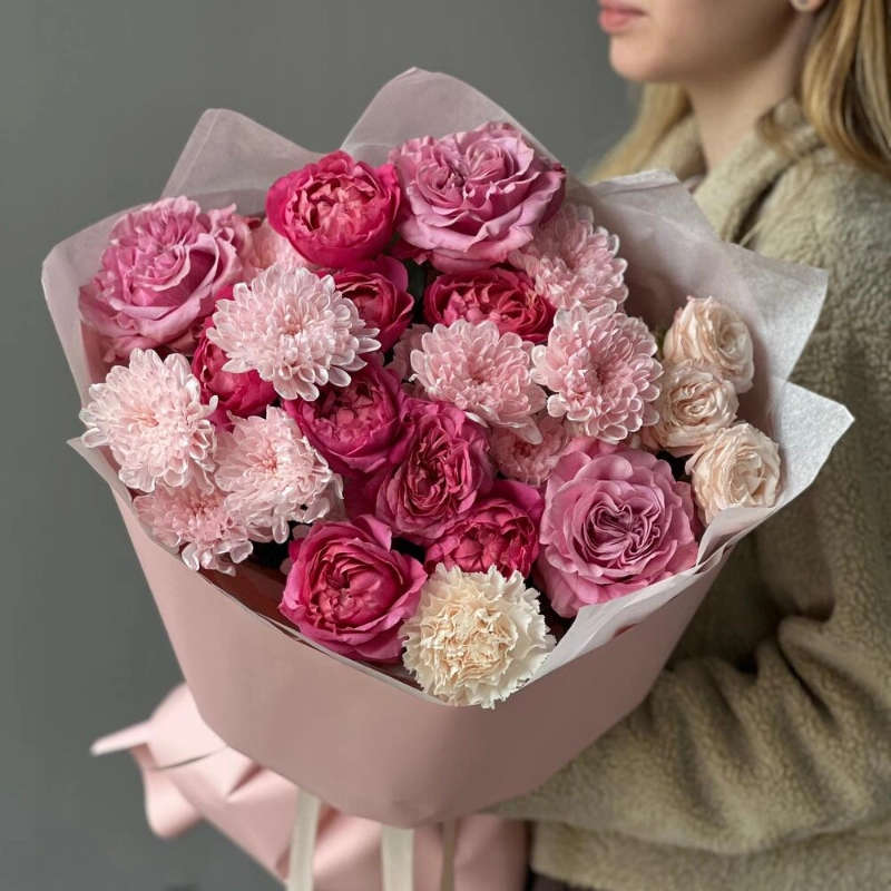 Яркий пышный большой букет из пионовидных ажурных роз- стильное сочетание и фактура! Приятный пышный подарок на любой повод