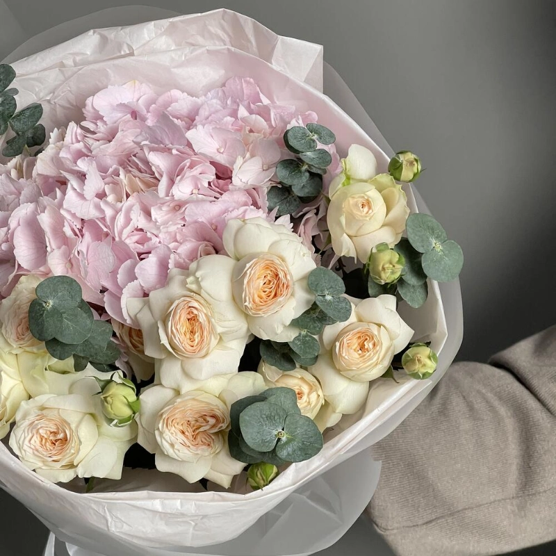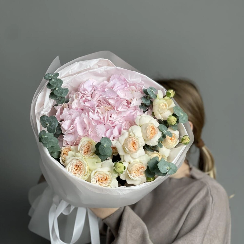 ГлавнаяКаталогБукетыАвторский букет с гортензией и кустовыми розами