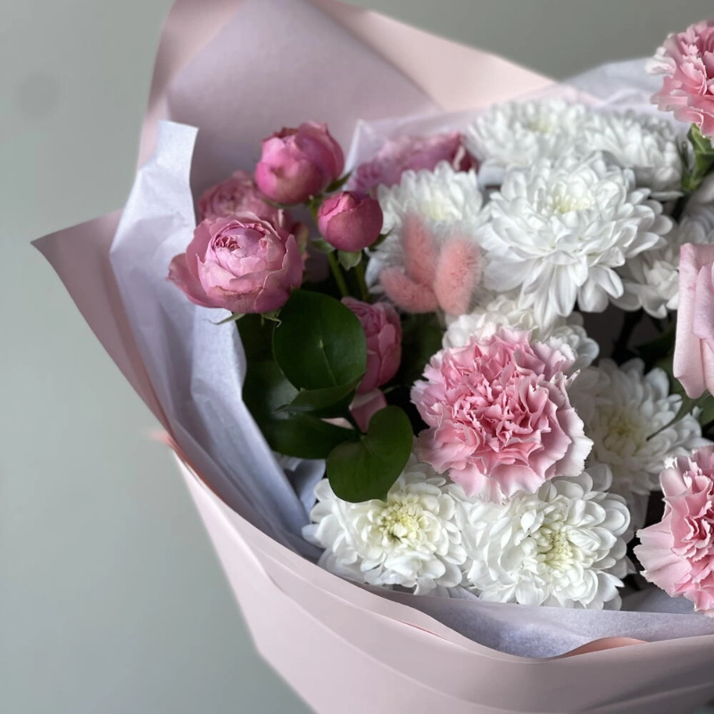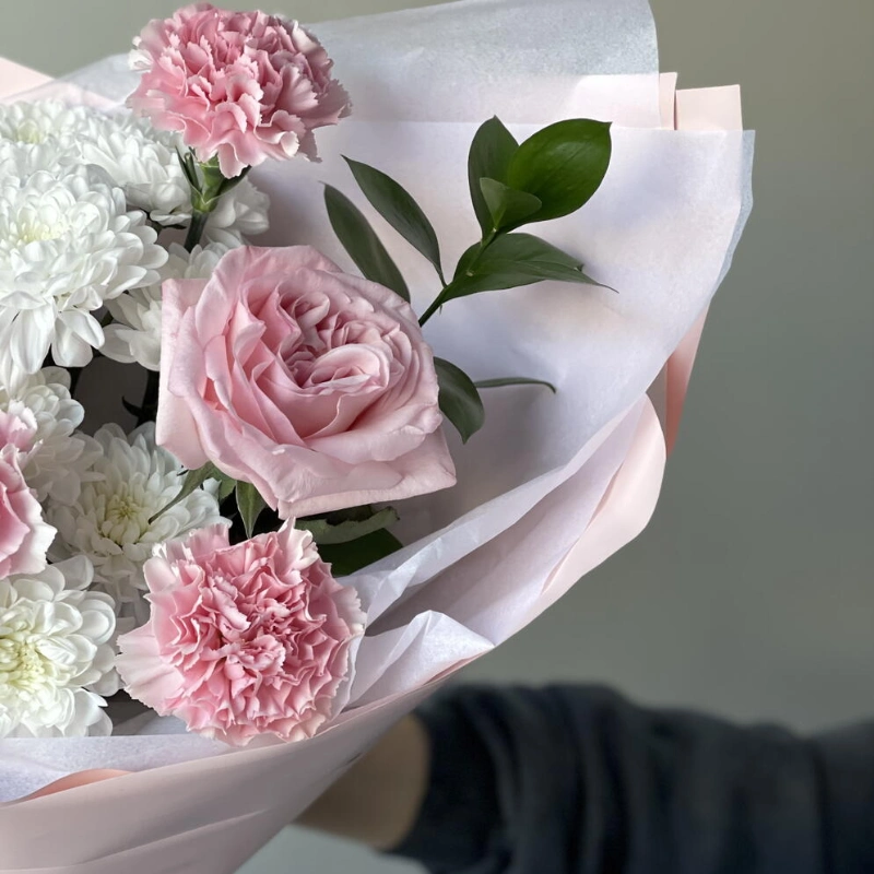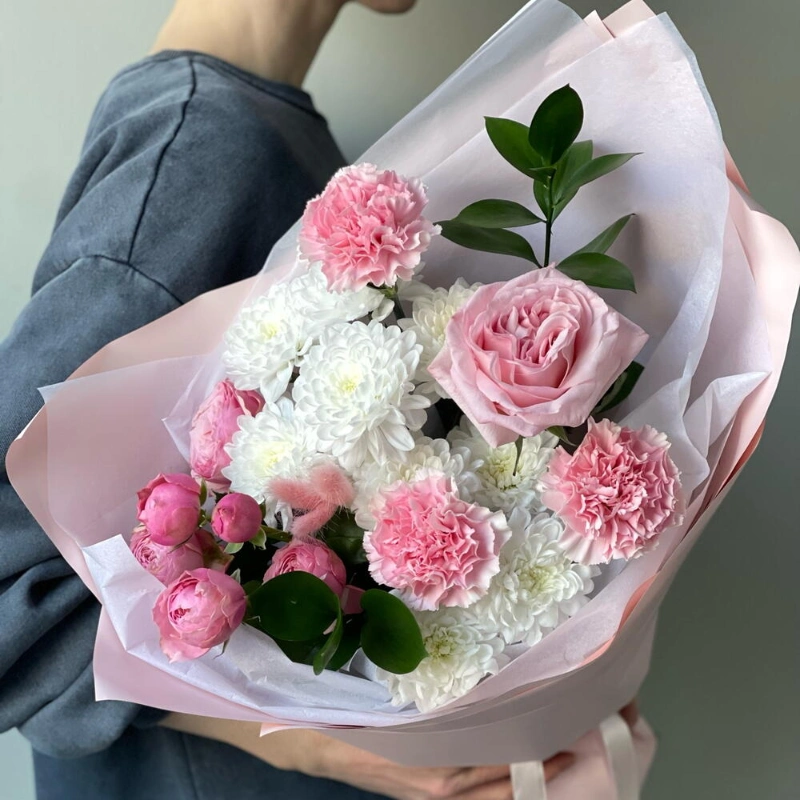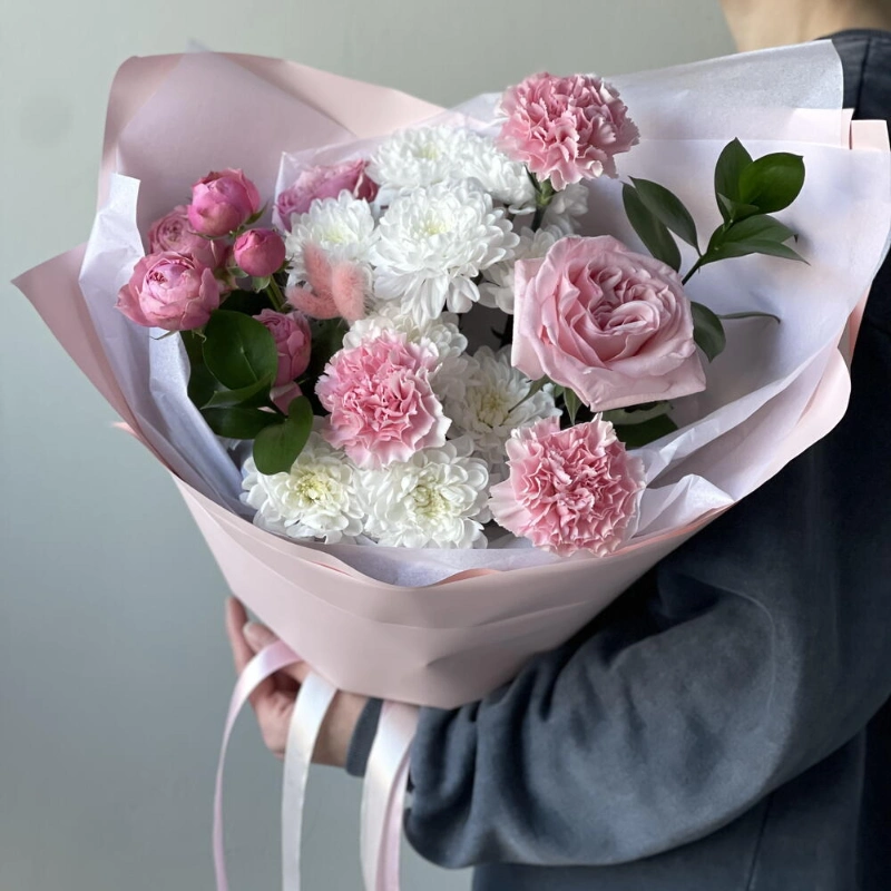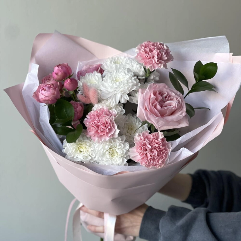 Ажурный букет с французскими розами, диантусами и кустовой хризантемой
