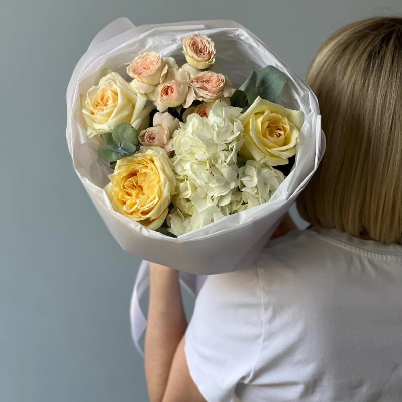 ГлавнаяКаталогБукетыБукет Гортензия, кустовые розы и Роза Канделайт