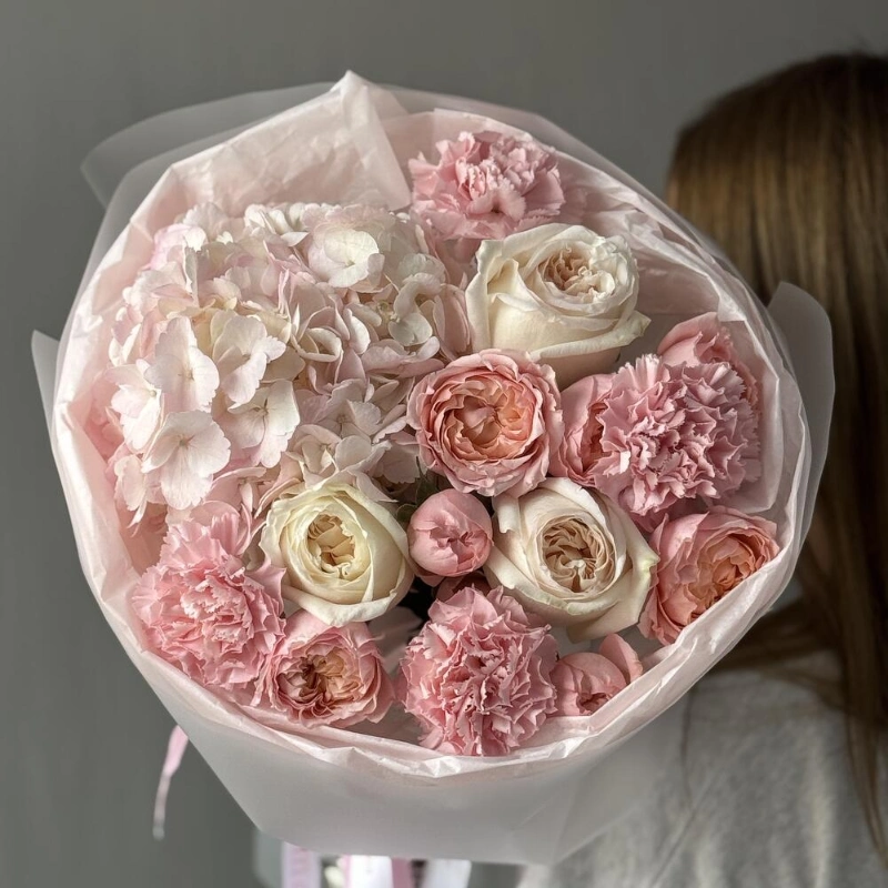 ГлавнаяКаталогБукетыЗефирный букет с розами и гортензией
