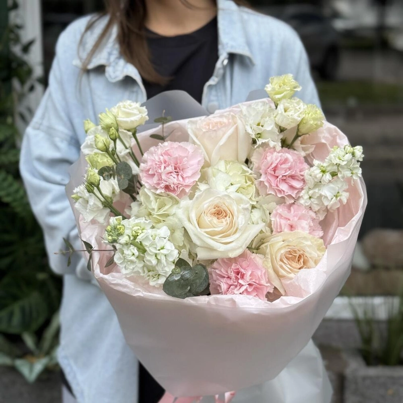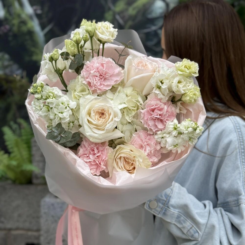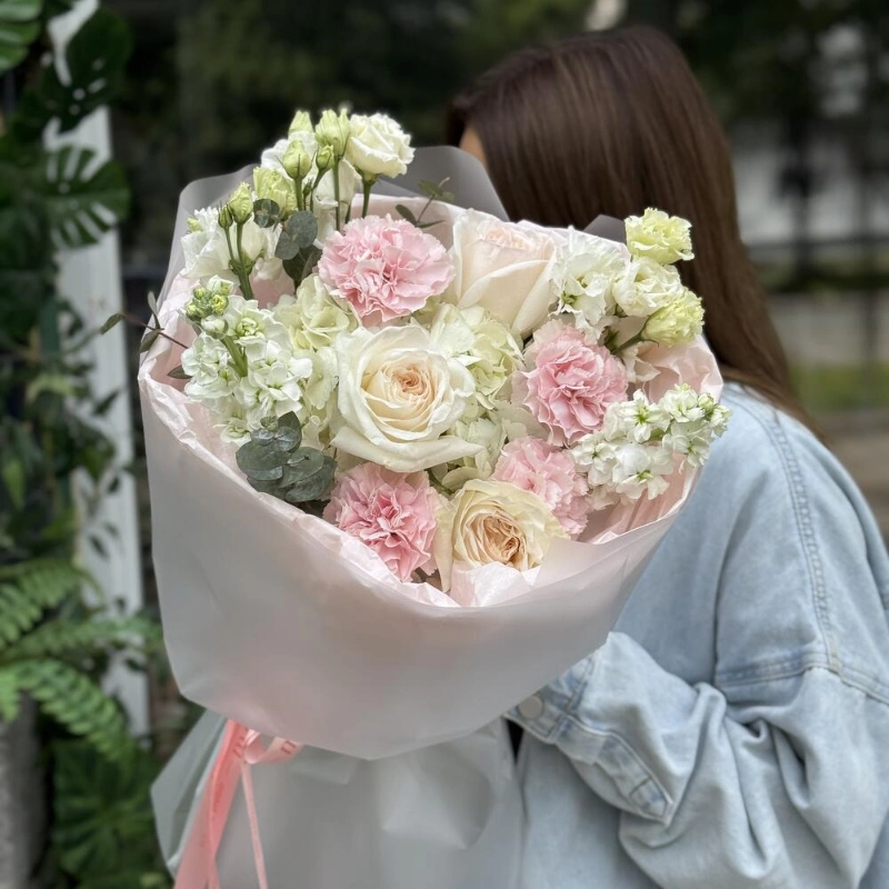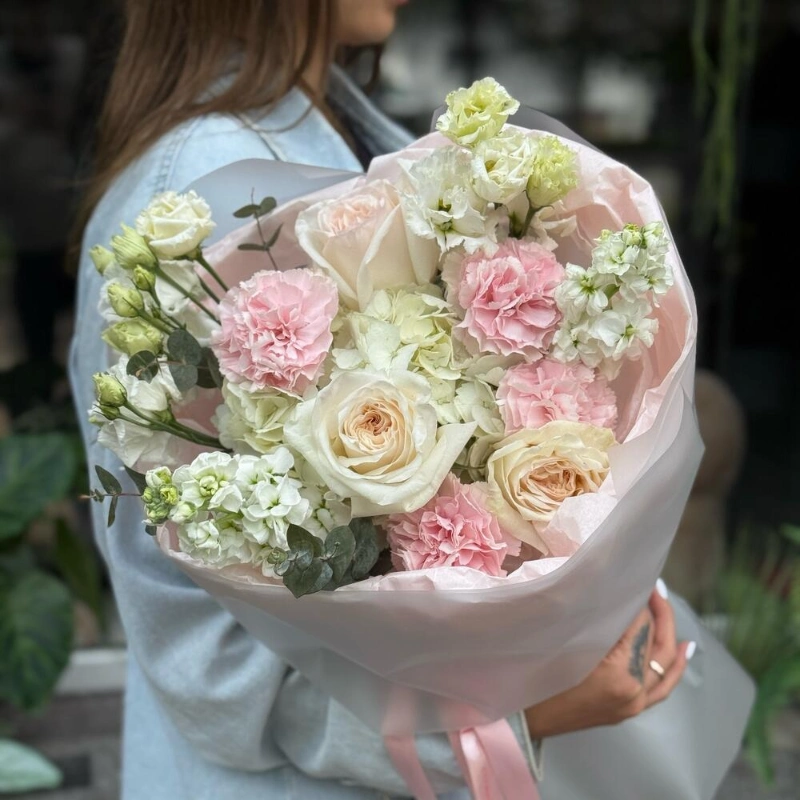 Букет из кустовых пионовидных и одноголовых французских роз