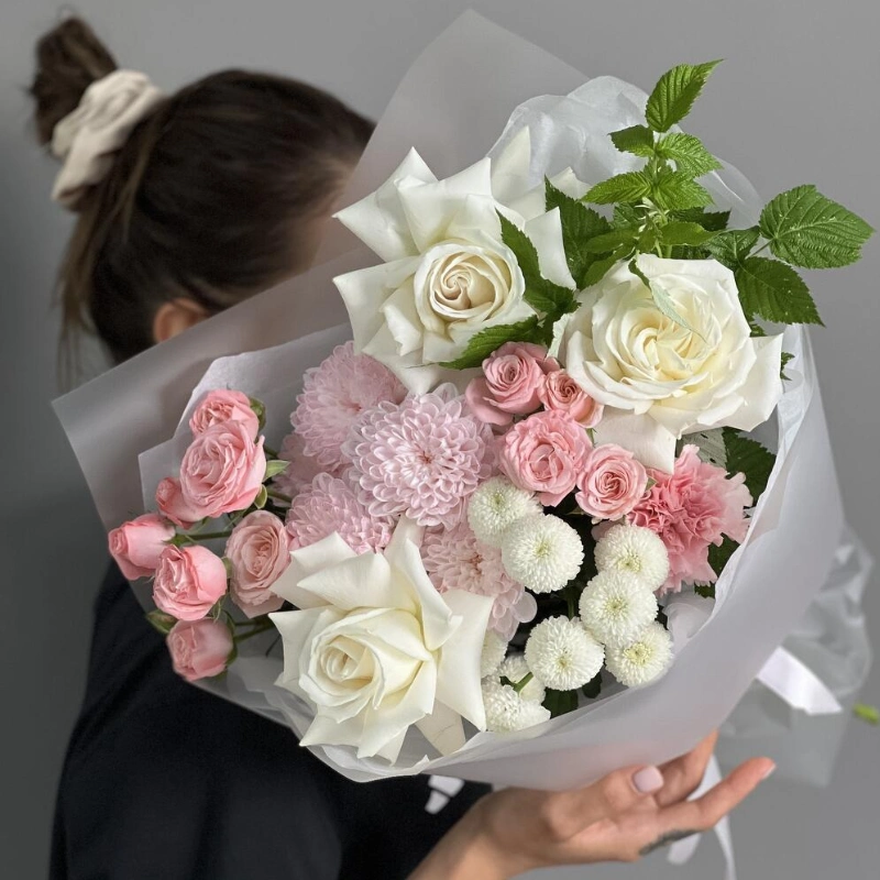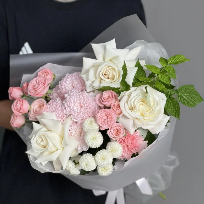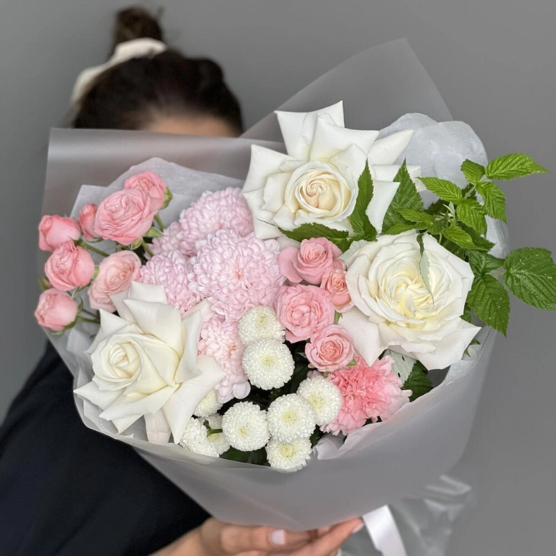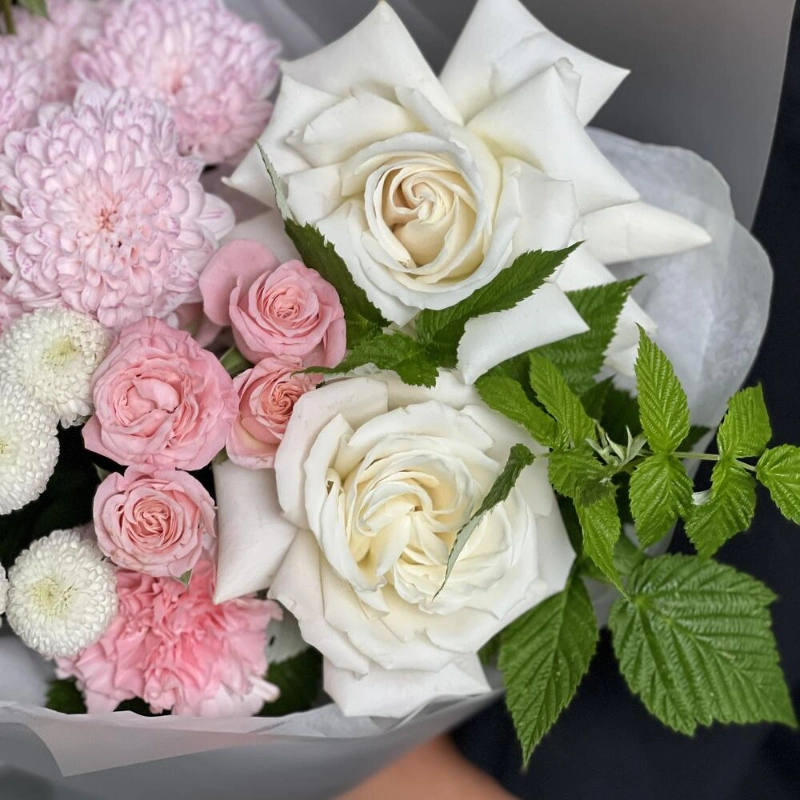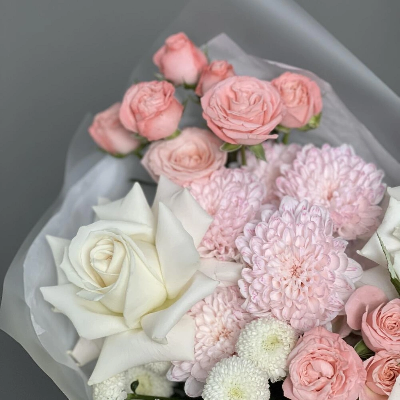 Ажурный букет с французскими розами, диантусами и кустовой хризантемой