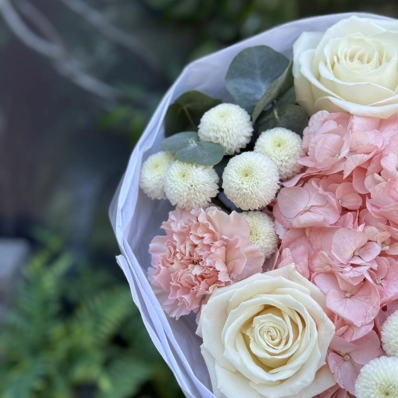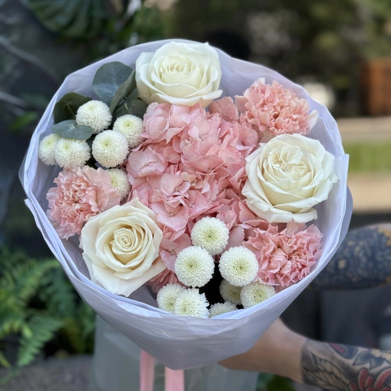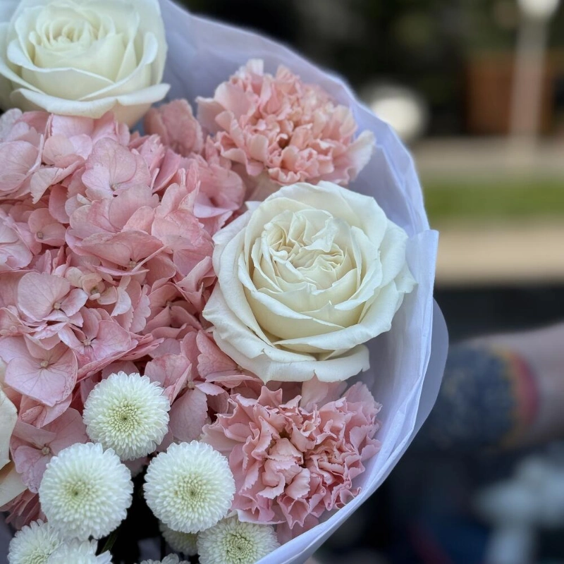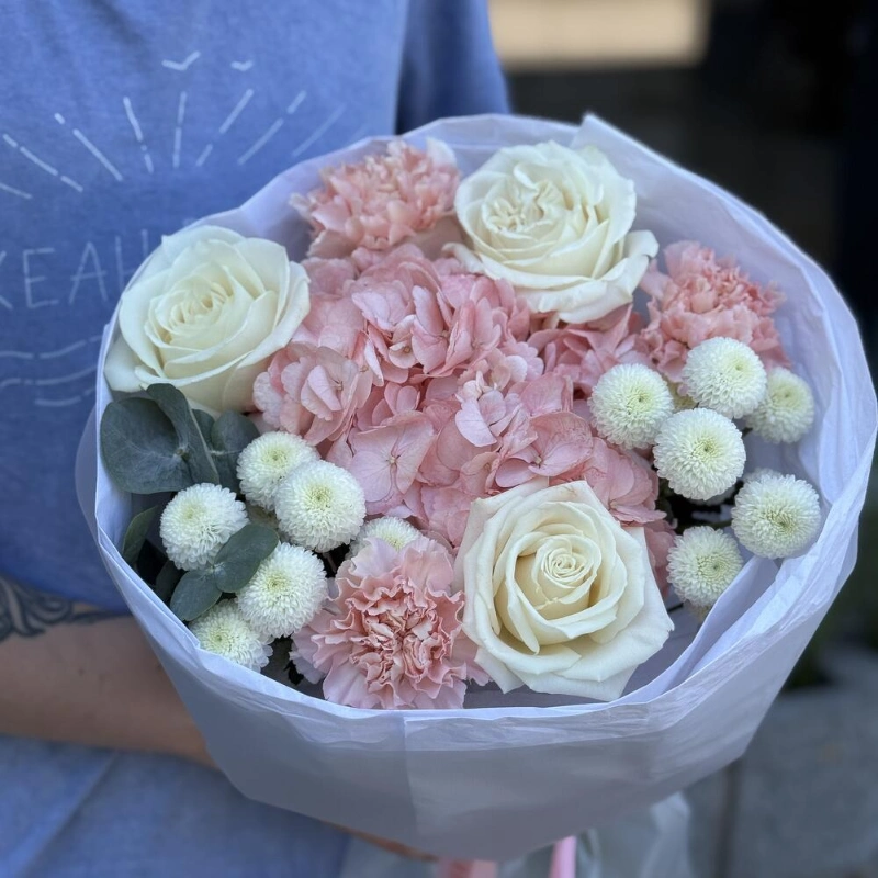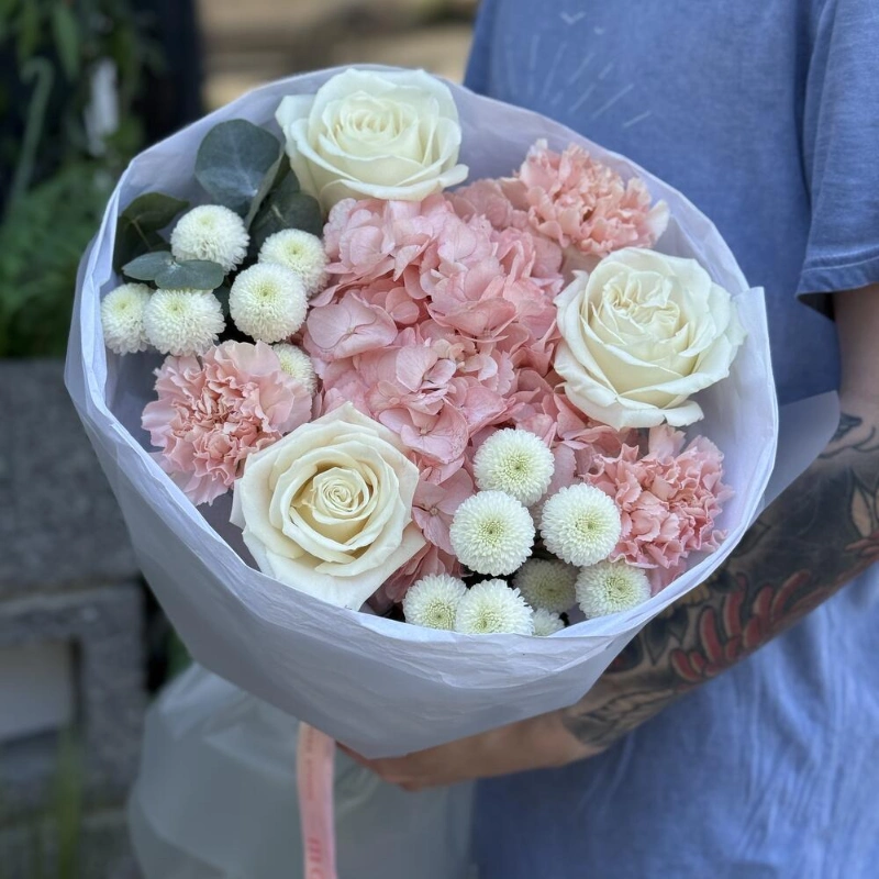 «Ароматный зефир» Маттиола, кустовые розы и хризантема