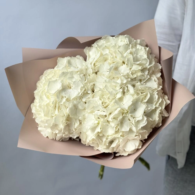 Этот букет состоит из трех великолепных белых гортензий. Их крупные, пышные соцветия создают ощущение воздушности и свежести. Белый цвет символизирует чистоту, невинность и искренность, делая этот букет универсальным и всегда уместным подарком.