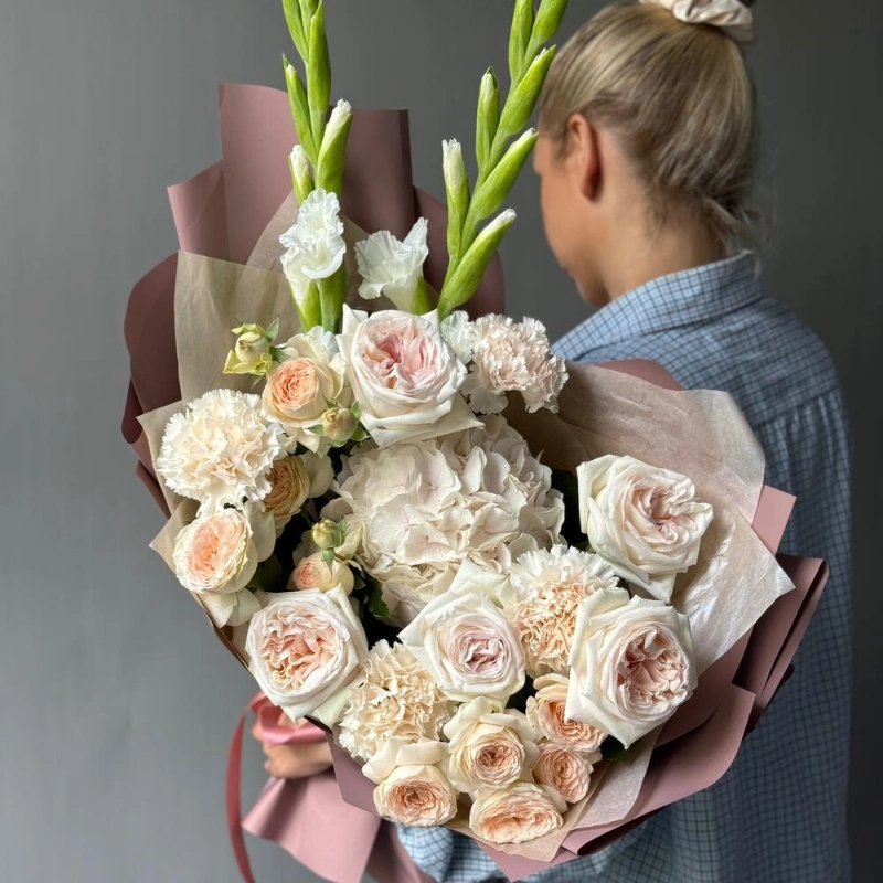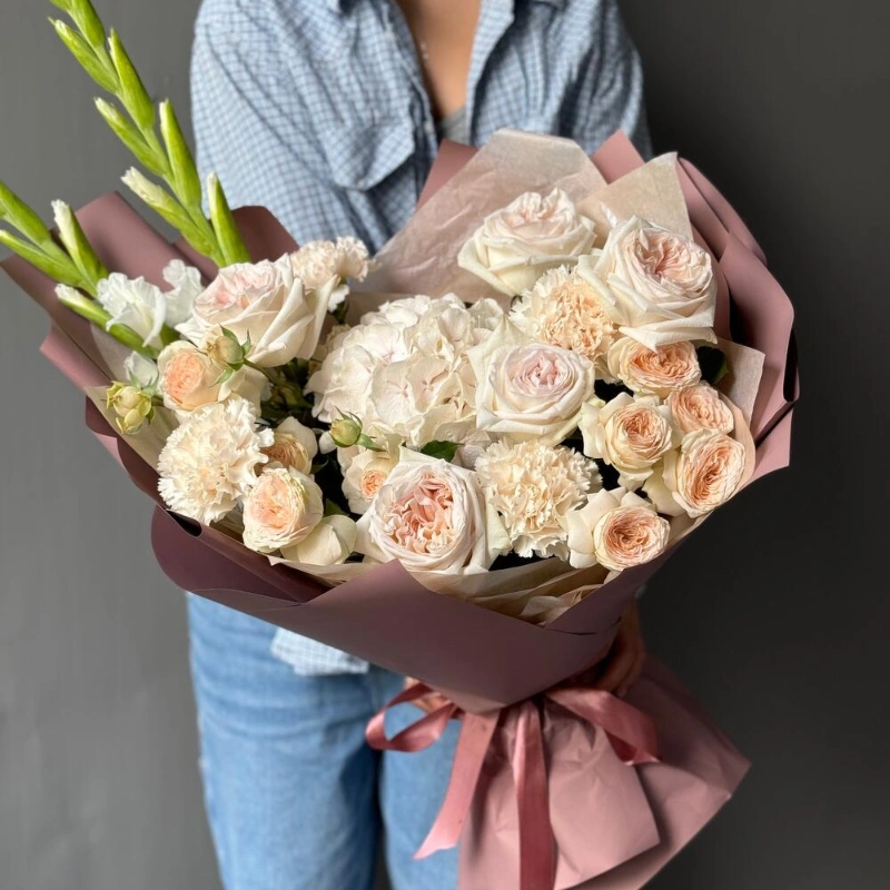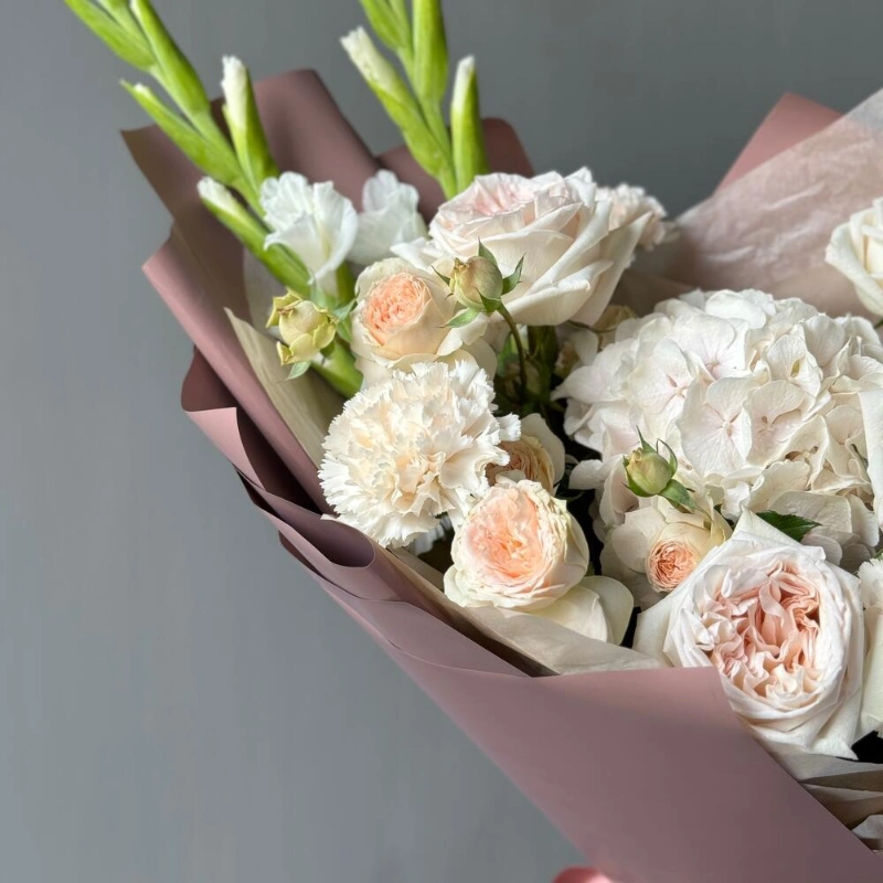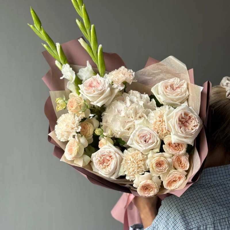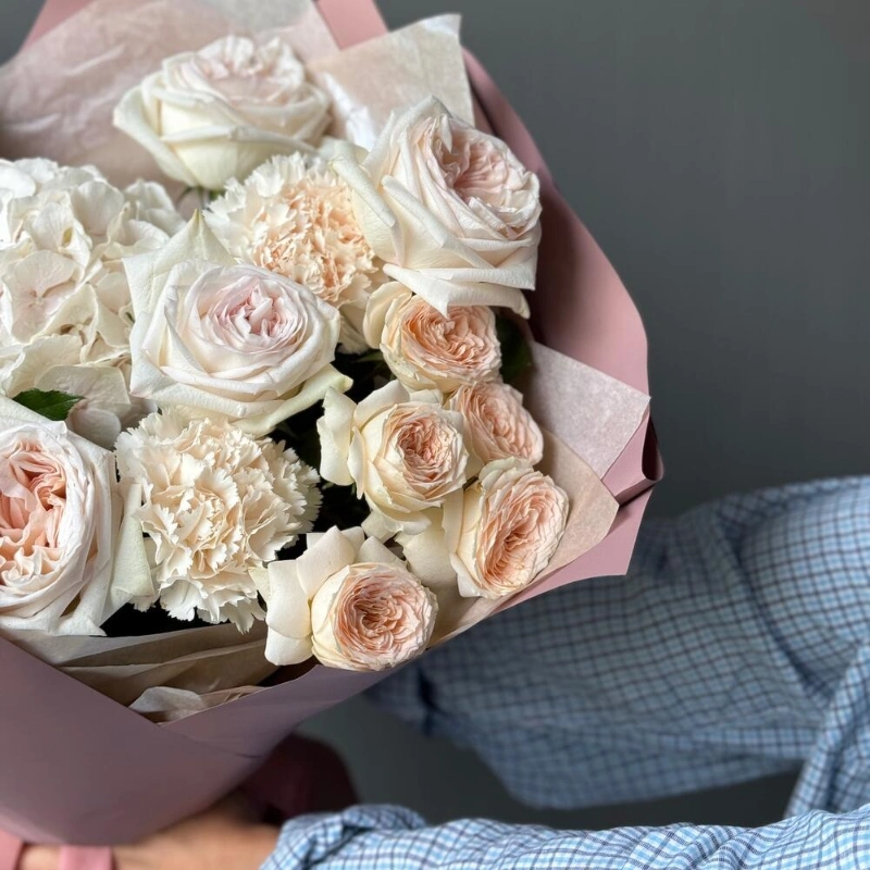Авторский букет «Нежность рассвета» с розами и гортензией