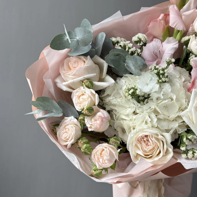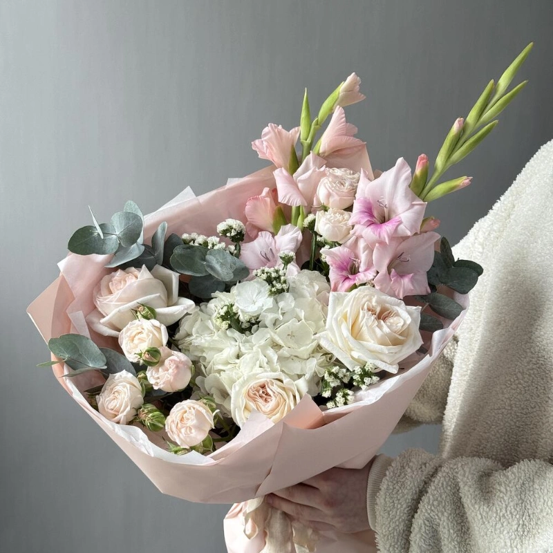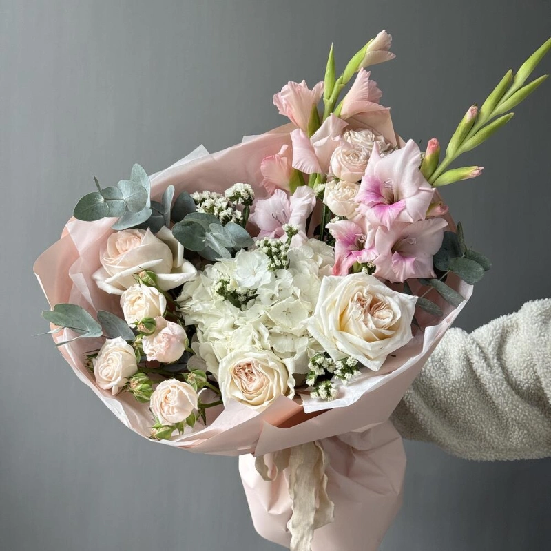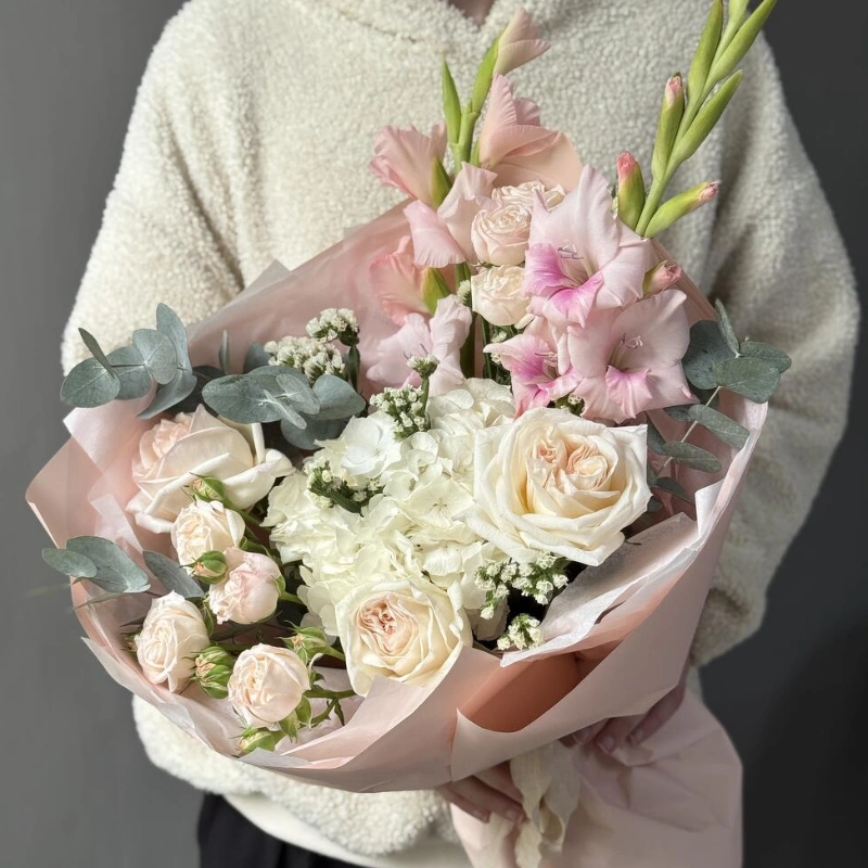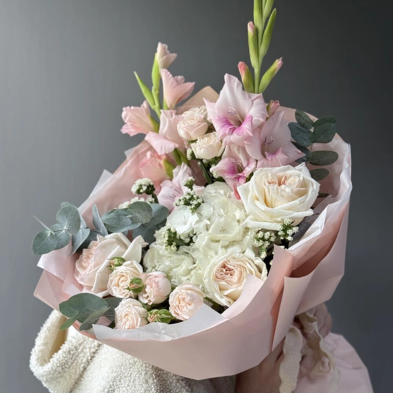 Белоснежный букет с гладиолусами, гортензией и пионовидными розами
