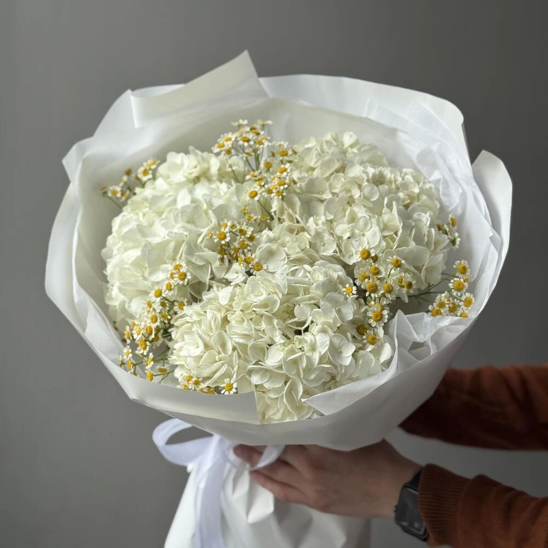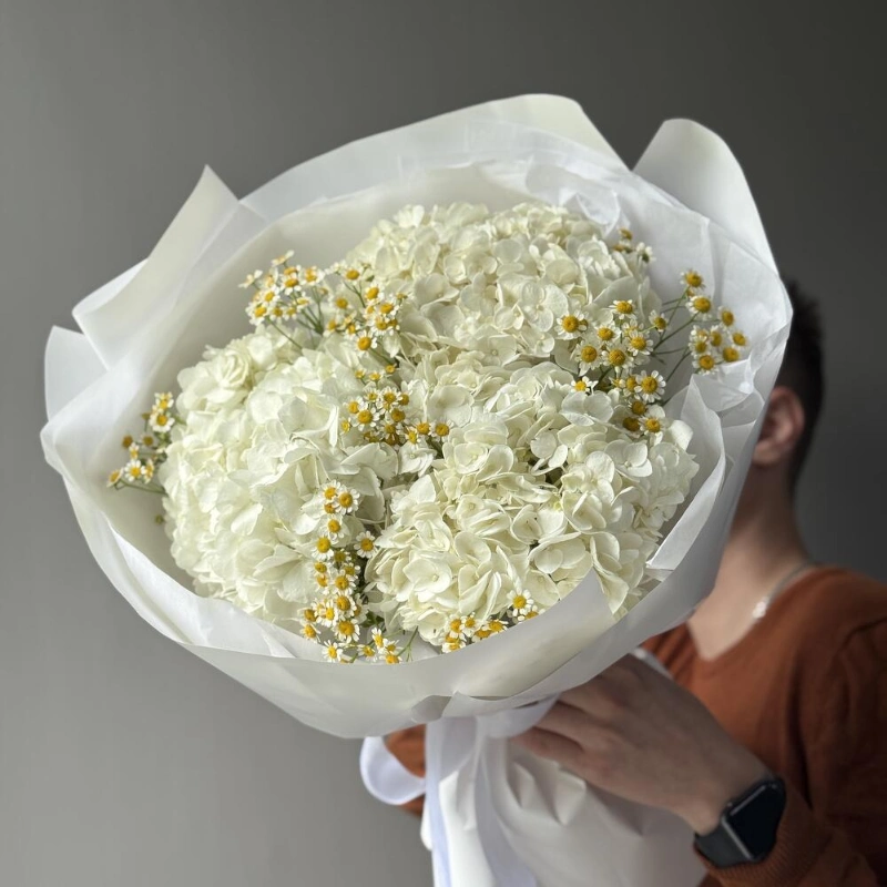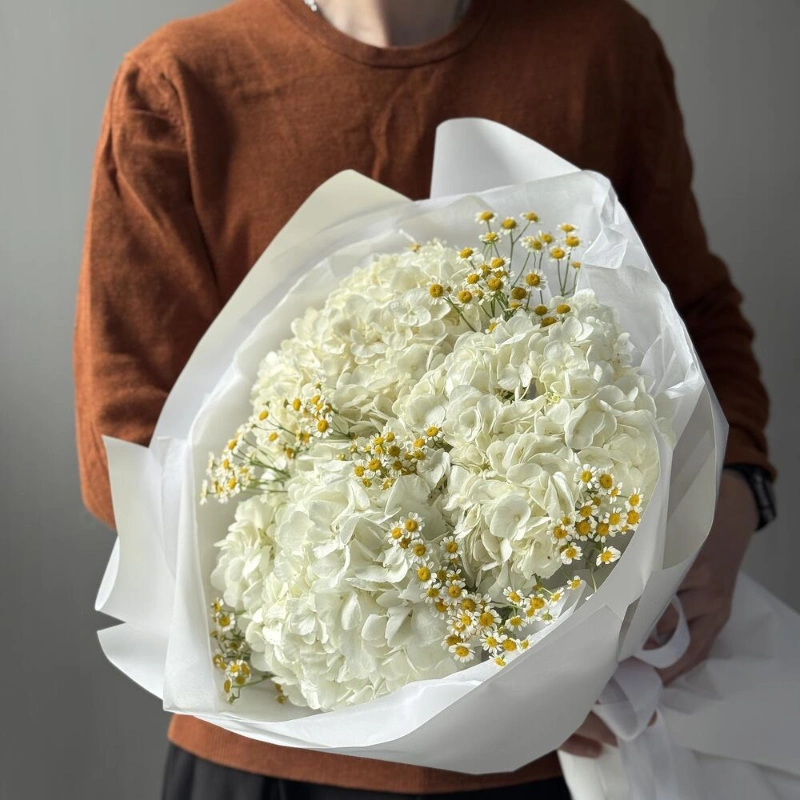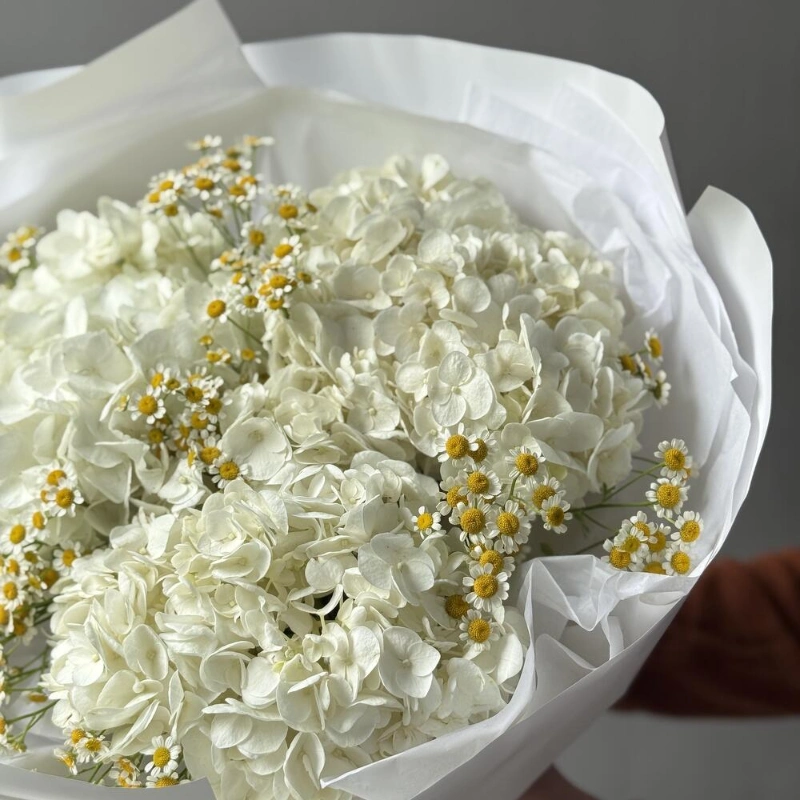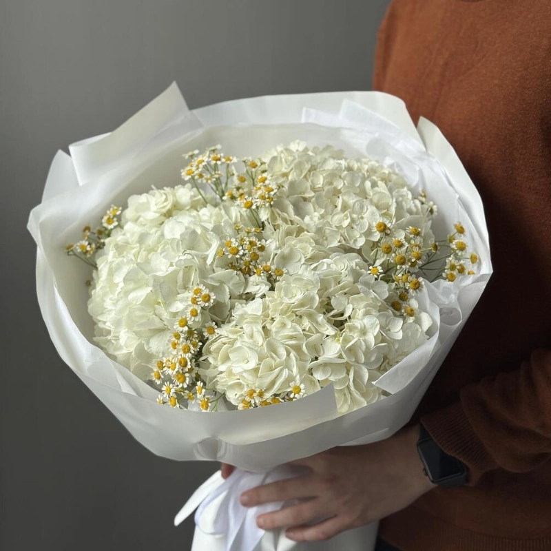 ГлавнаяКаталогБукеты«Летнее небо» с ромашками и гортензиями