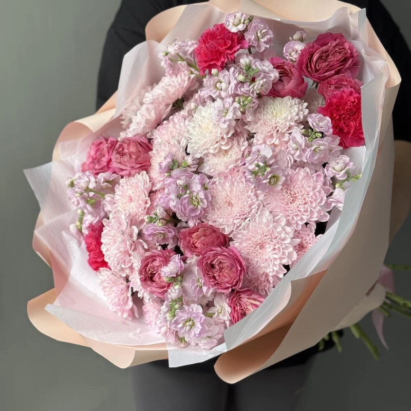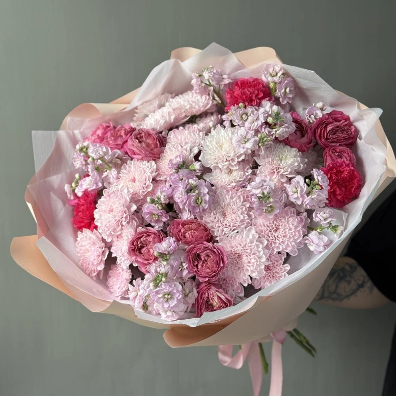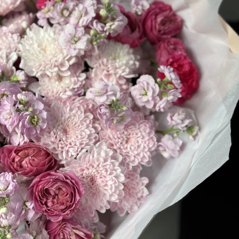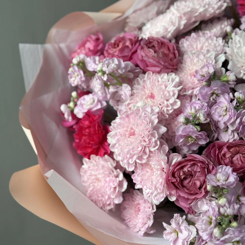 «Ароматный зефир» Маттиола, кустовые розы и хризантема