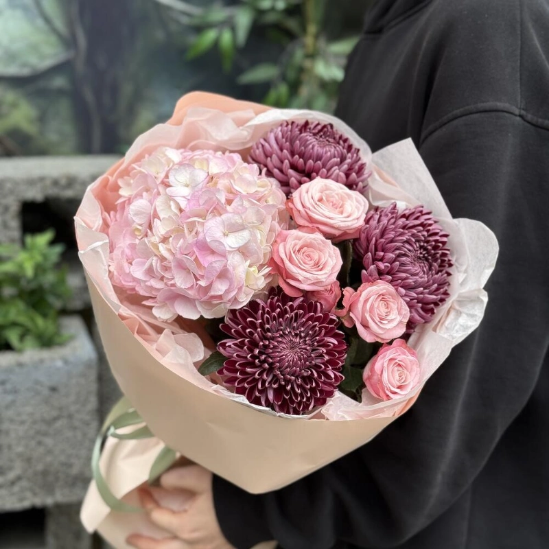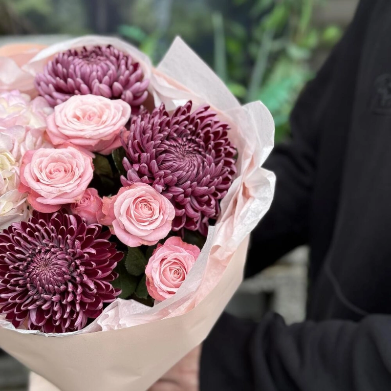 Пышный букет розы, хризантема, гвоздика