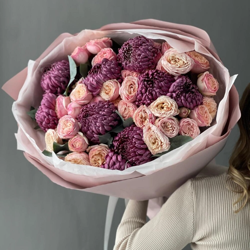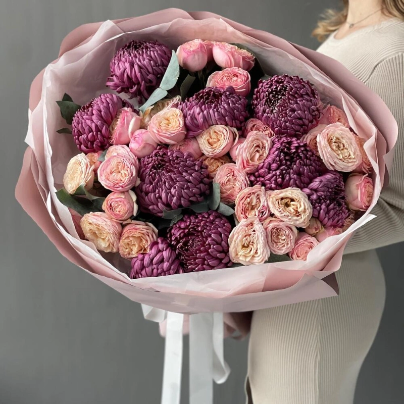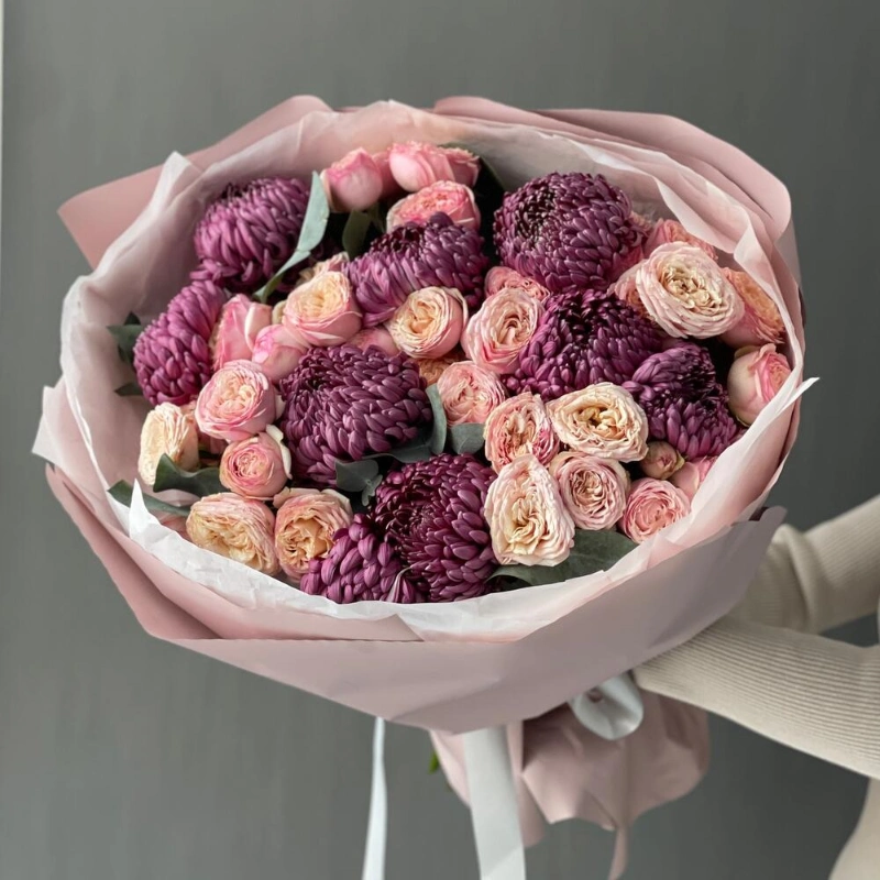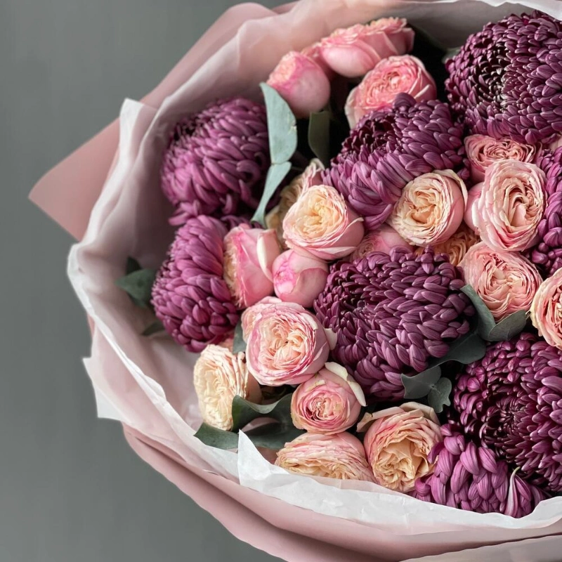 ГлавнаяКаталогБукетыСборный букет с сезонными хризантемами и кустовыми розами