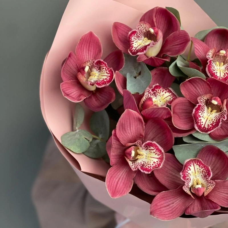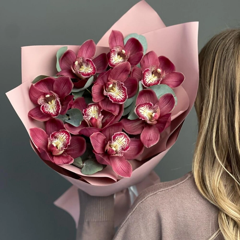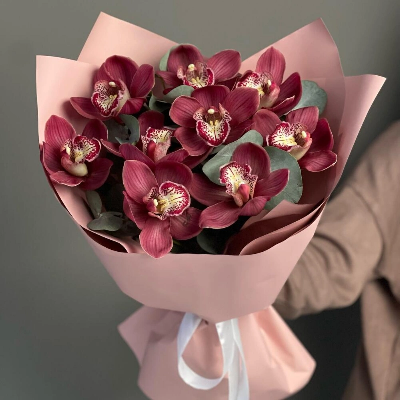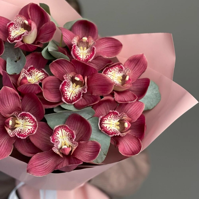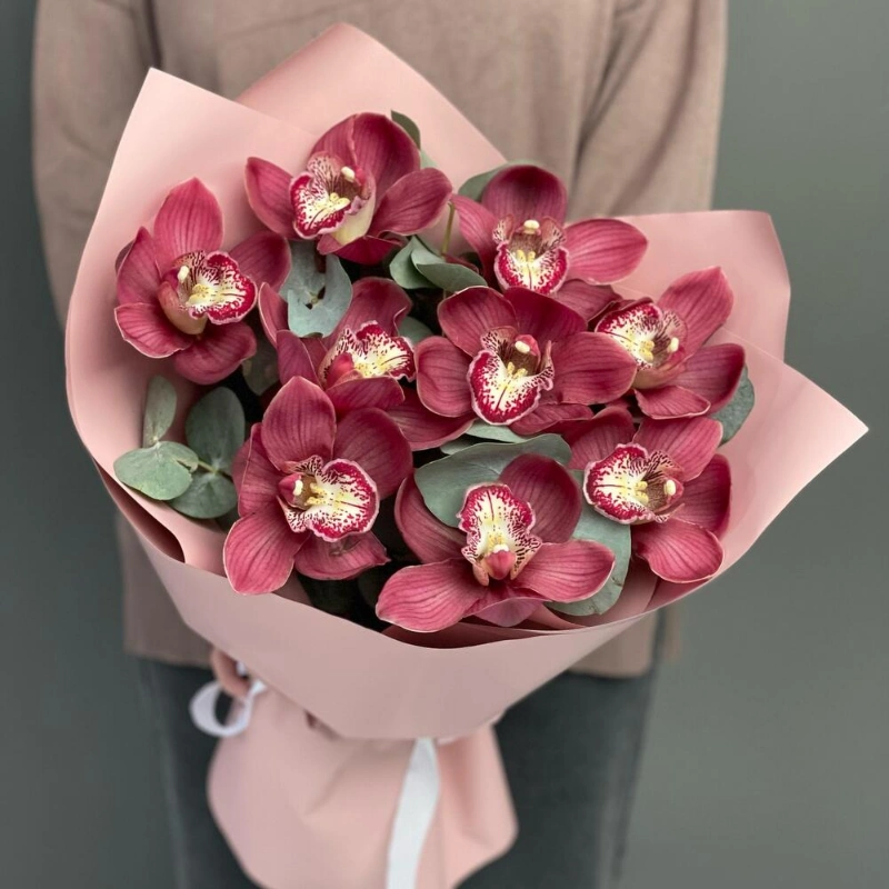 Этот букет из орхидей — воплощение изысканности и утонченности. Яркие бордовые цветы привлекают внимание и вызывают восхищение. Букет упакован в нежную розовую бумагу, что добавляет ему романтичности и делает его идеальным подарком для любого случая. Орхидеи — это символ любви, красоты и роскоши, и этот букет точно передаст все эти чувства.