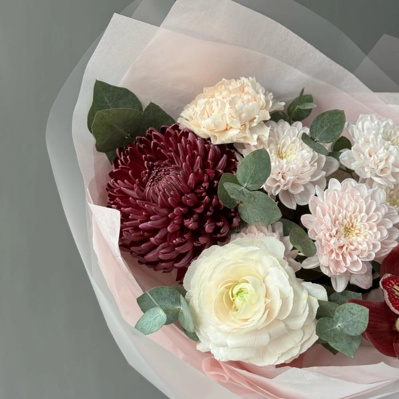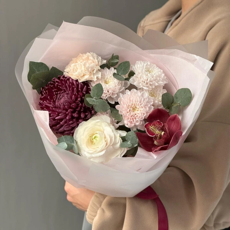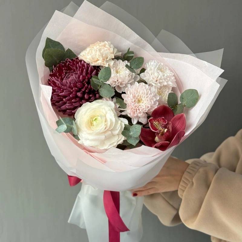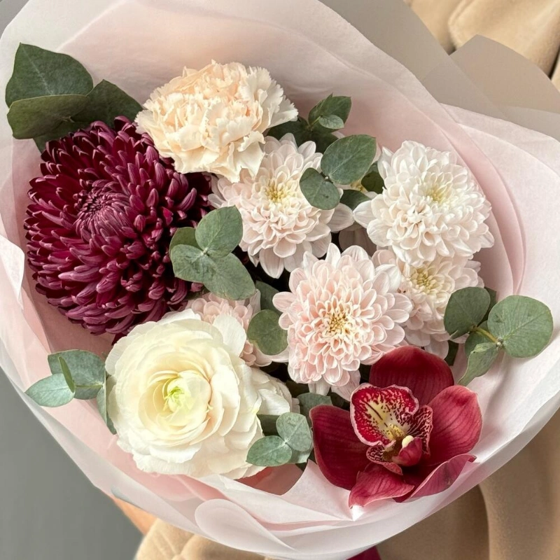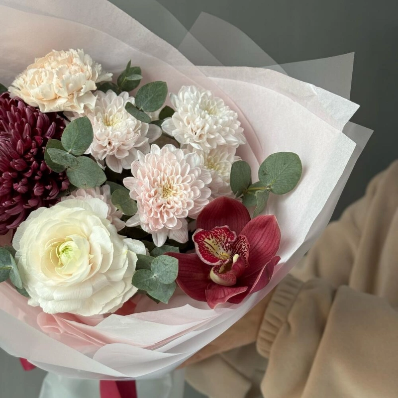 Этот букет сочетает в себе разнообразие и гармонию. В его составе — кустовая хризантема, символизирующая радость и оптимизм, орхидея, олицетворяющая роскошь и утонченность, ранункулюс, который ассоциируется с нежностью и красотой, диантус, добавляющий нотку свежести и игривости, эвкалипт, который привносит в композицию экзотику и завершенность, и хризантема бигуди, добавляющая изысканность и объем. Все эти цветы собраны вместе, создавая уникальный и запоминающийся букет, который станет прекрасным подарком для любого случая.