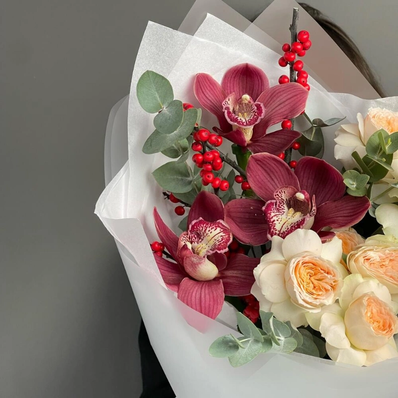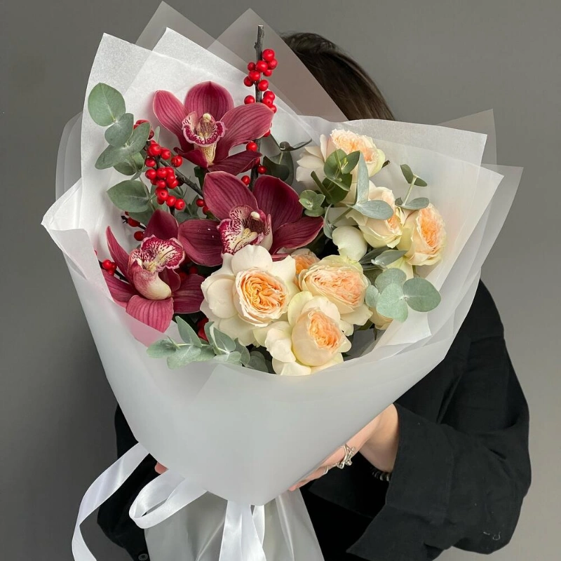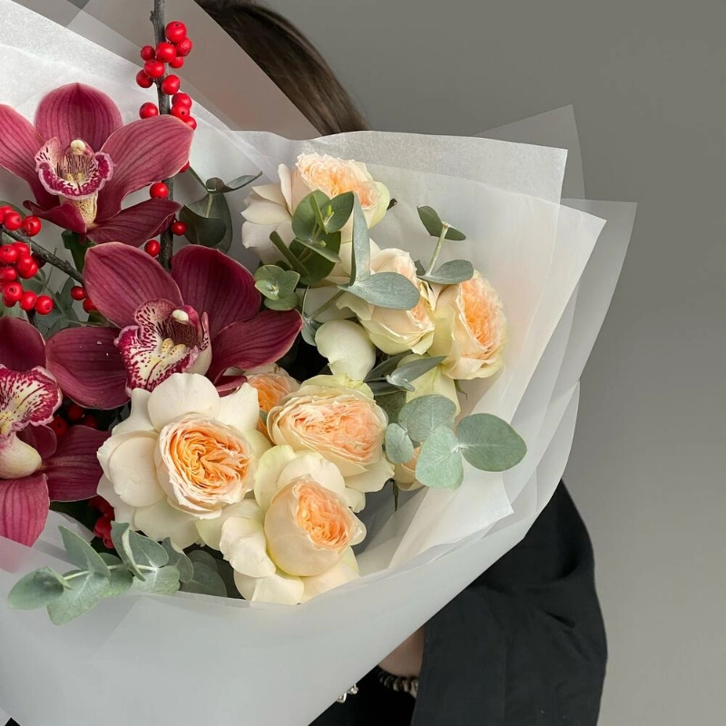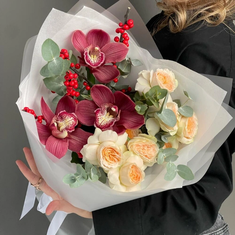 Авторский сборный букет с орхидеей, кустовыми розами и илексом