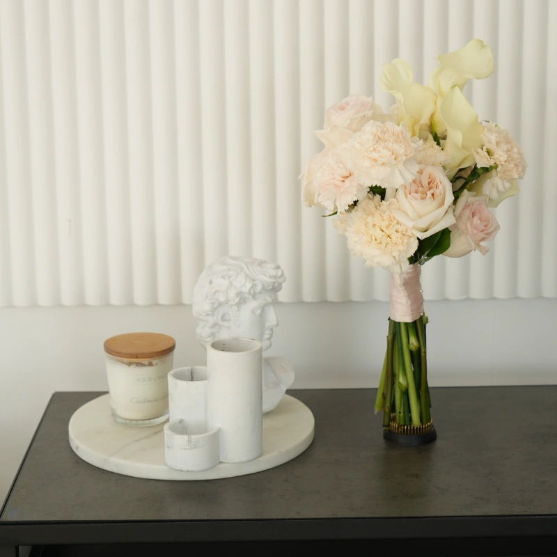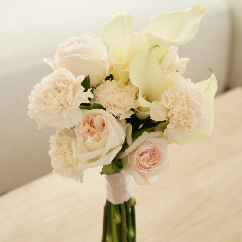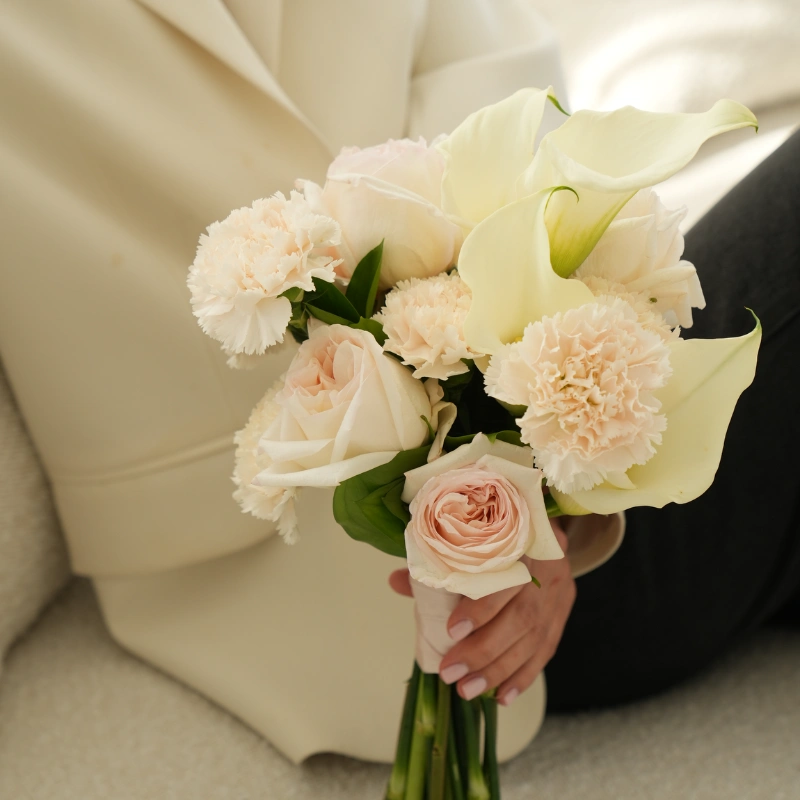 ГлавнаяКаталогБукетыЭлегантный букет с каллами и пионовидными розами