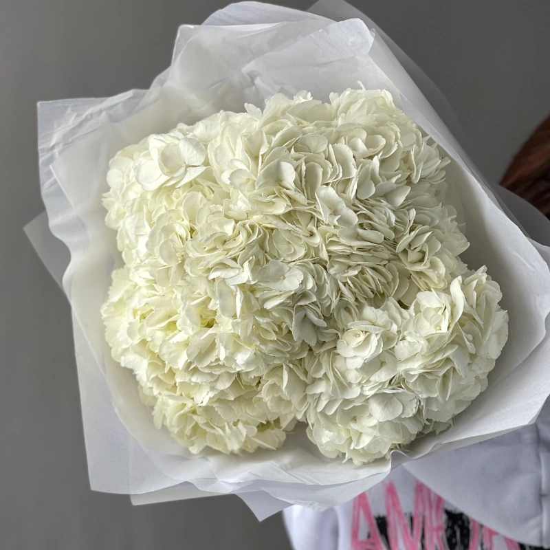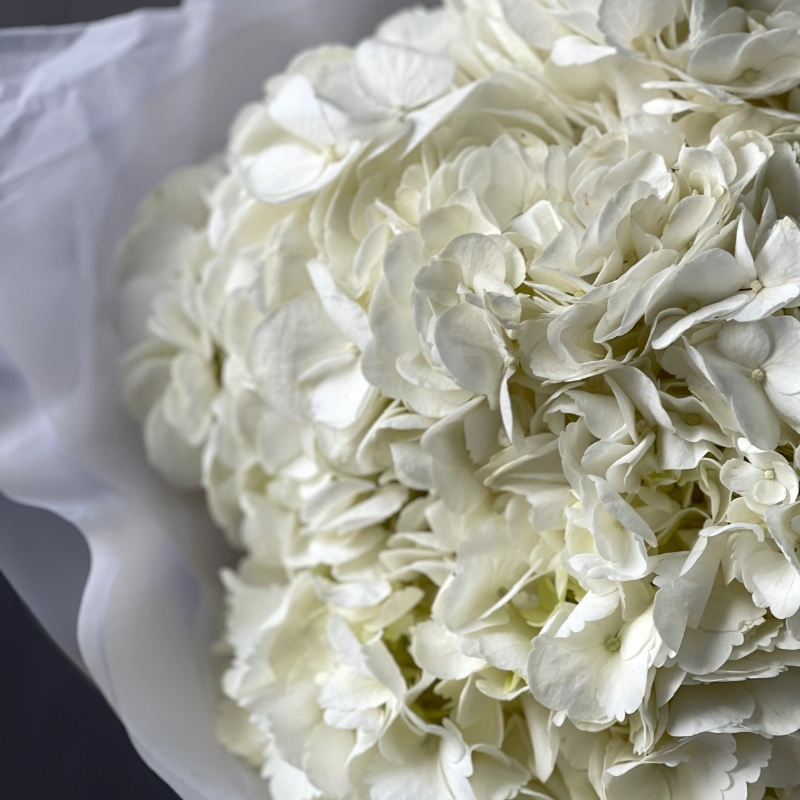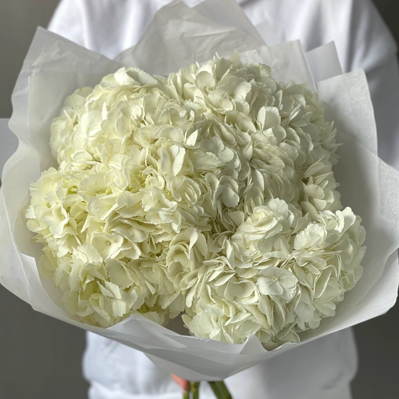 Букет «Облако гортензий» 5шт из воздушных белоснежных гортензий в матовой упаковке