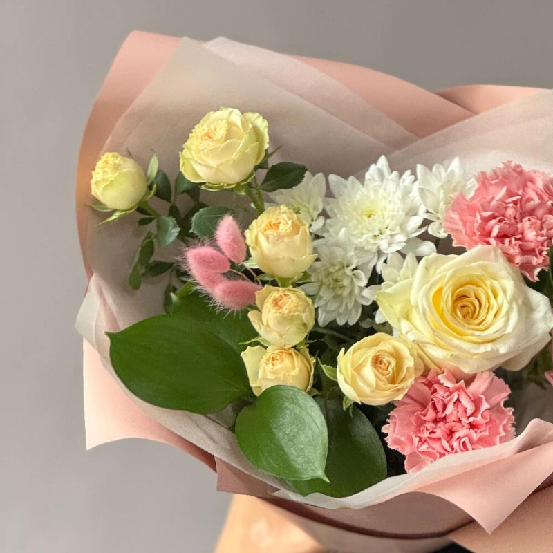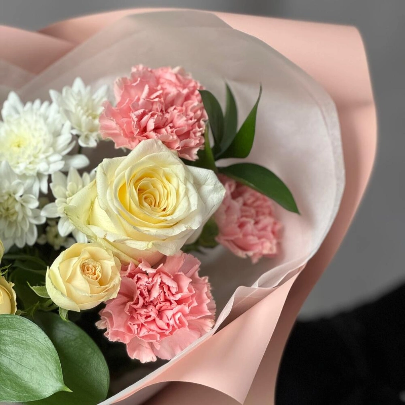 Ажурный букет с французскими розами, диантусами и кустовой хризантемой