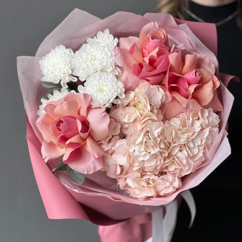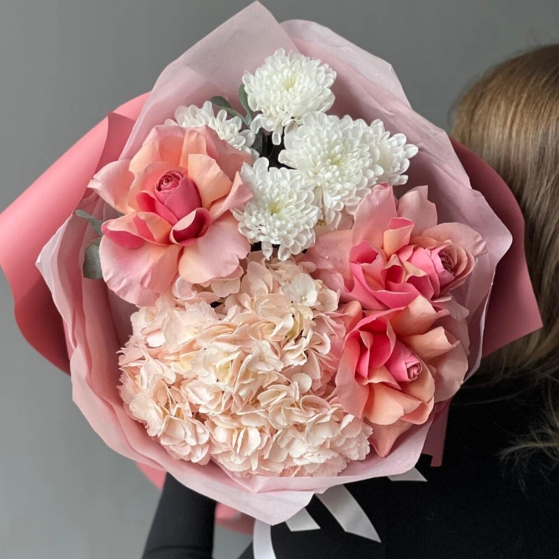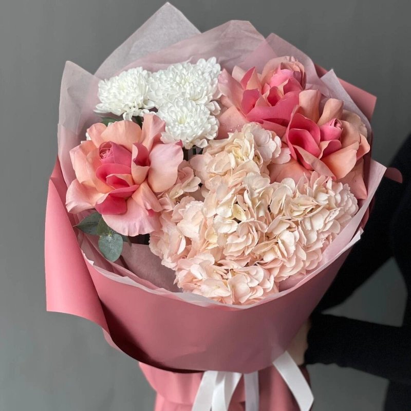 ГлавнаяКаталогБукетыБукет французские розы, гортензия, хризантема