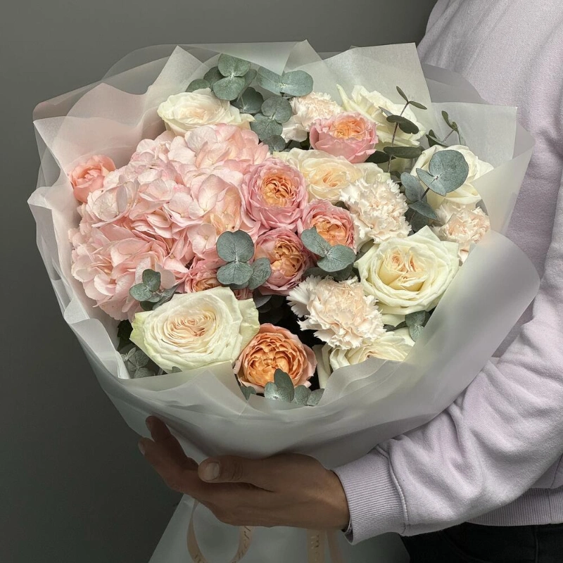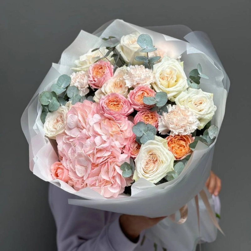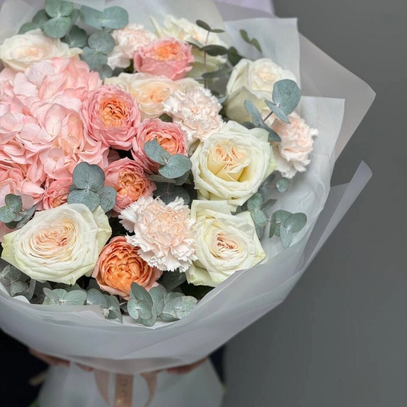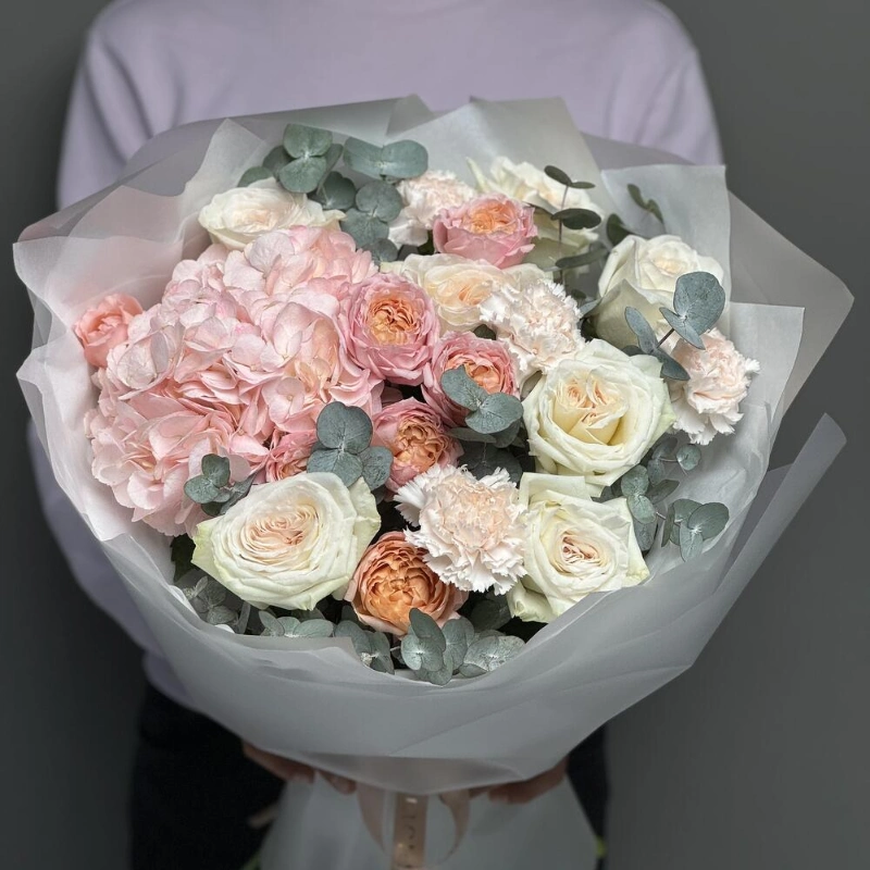 Нежный букет с гортензией, кустовыми розами премиум плантации сорта «Джульетта», парфюмированными Розами «Вайт Охара», в сочетание со стойкими диантусами и ароматным эвкалиптом