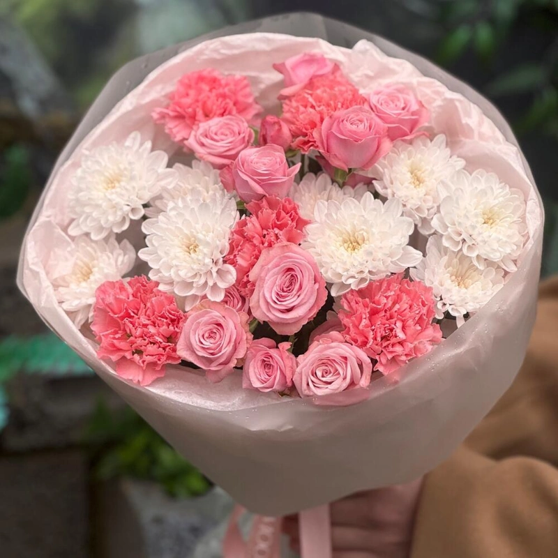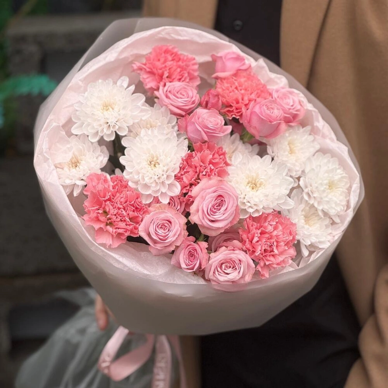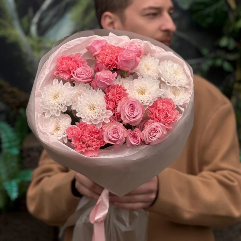 Букет из кустовых пионовидных роз, кустовой пышной хризантемы и нежных диантусов 🌸 Букет стойкий и пышный, очень понравится получателю