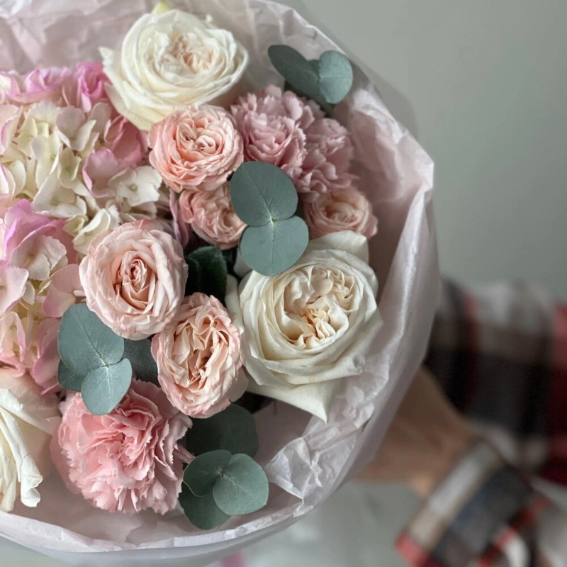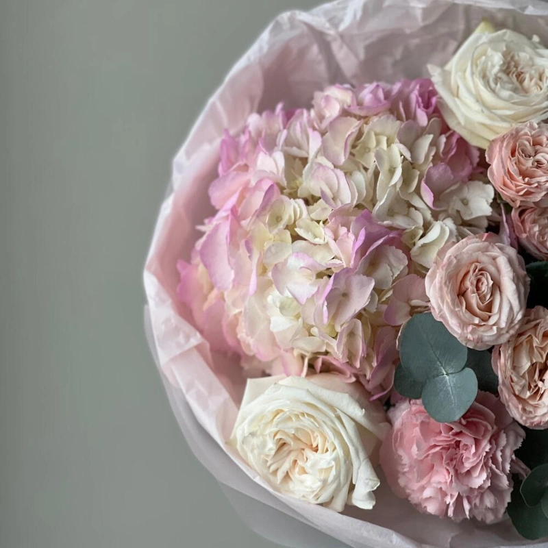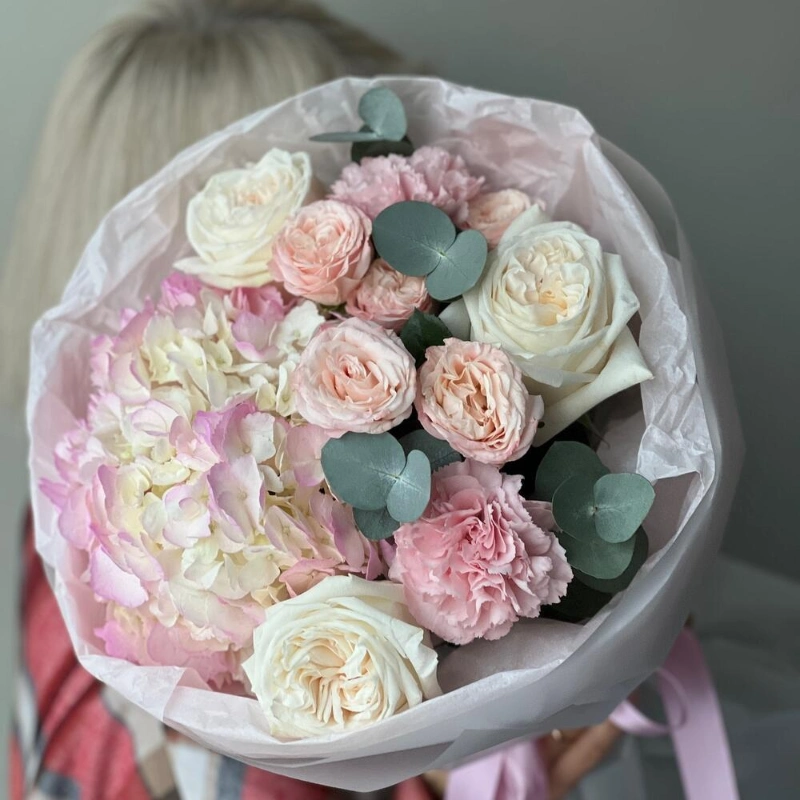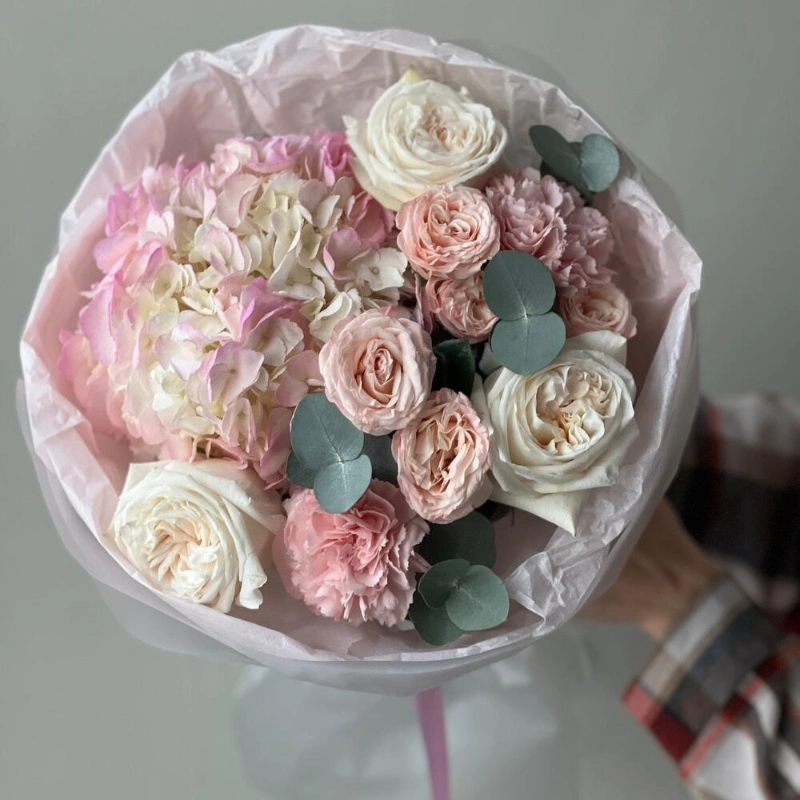 В составе букета Гортензия, нежные кустовые пионовидные розы, одноголовые ароматные розы, махровые стильные сортовые диантусы, стильный эвкалипт, лаконичная светлая упаковка!