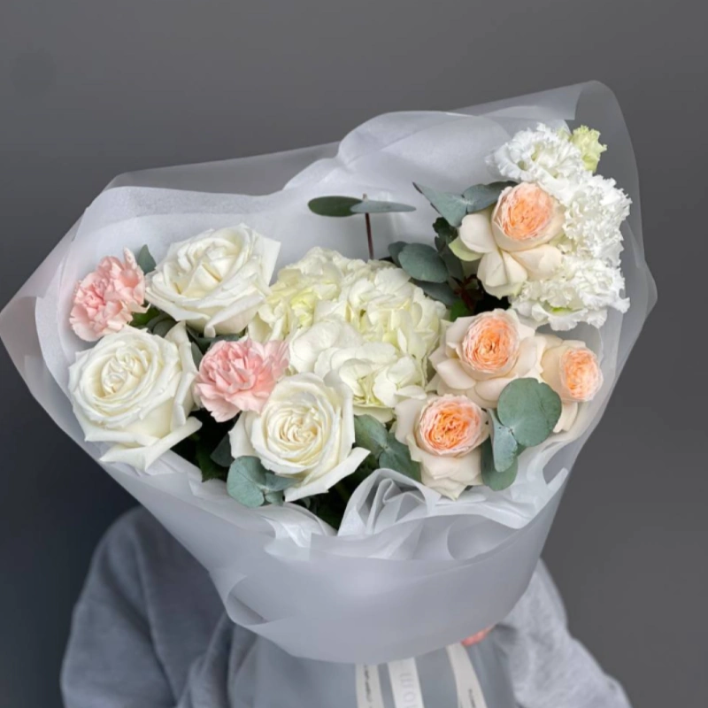 Воздушный букет с гортензией, кустовыми и одноголовыми розами , диантусами