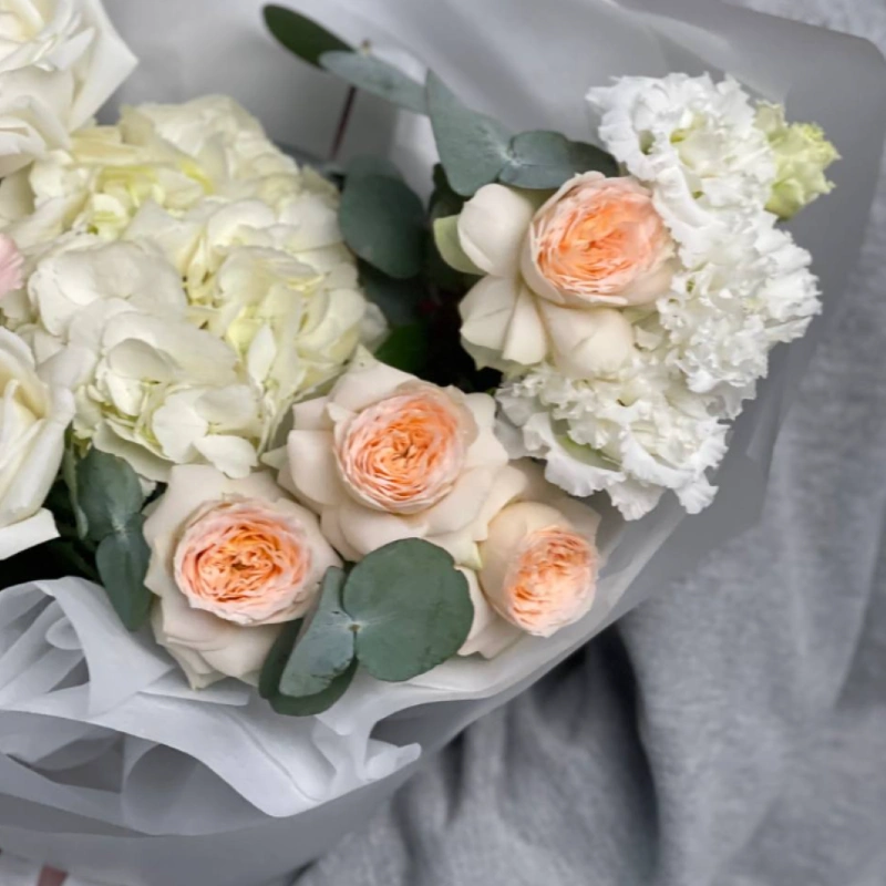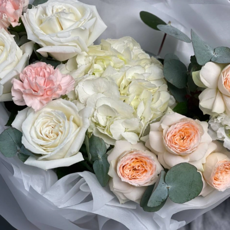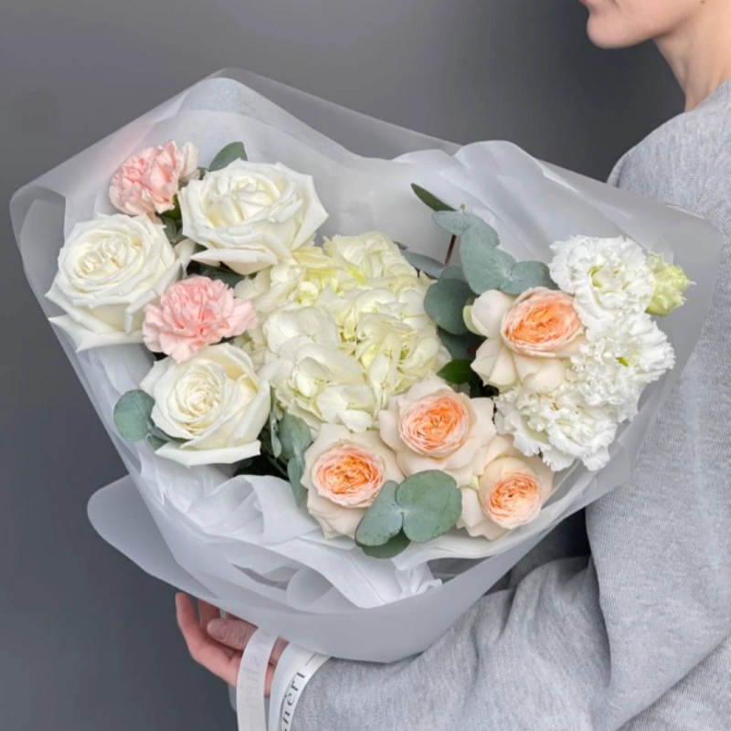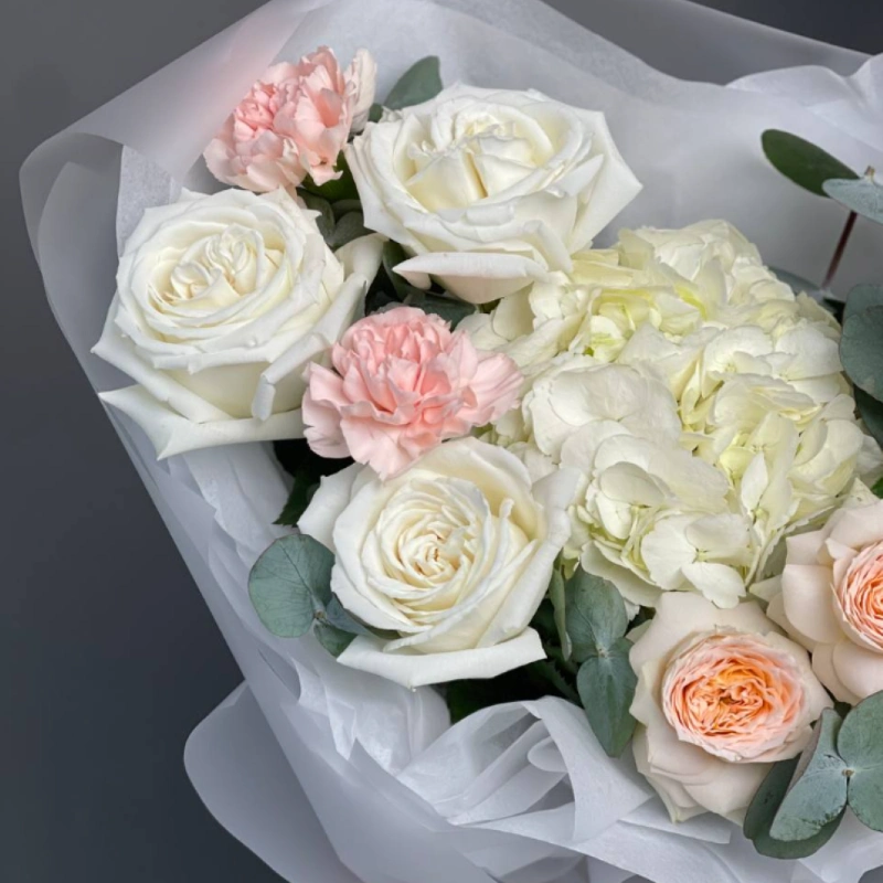 Авторский букет «Нежность рассвета» с розами и гортензией