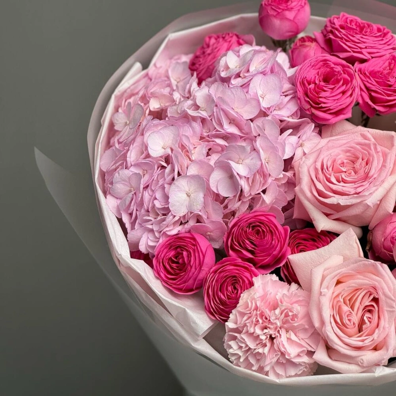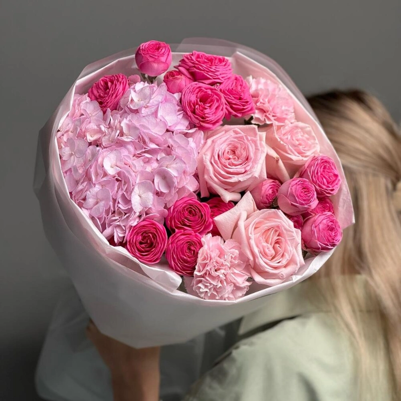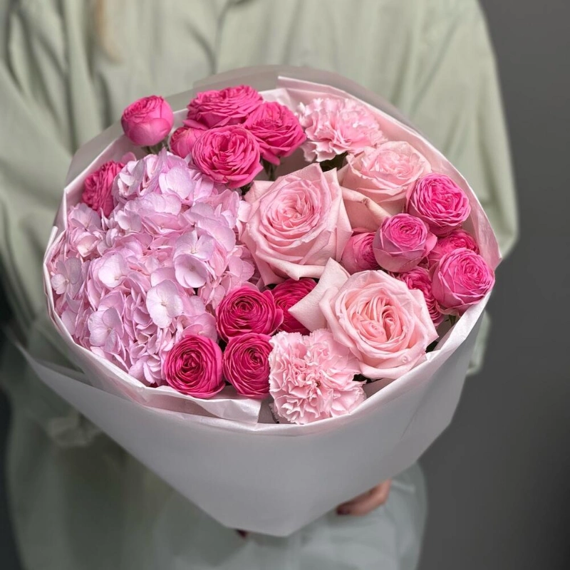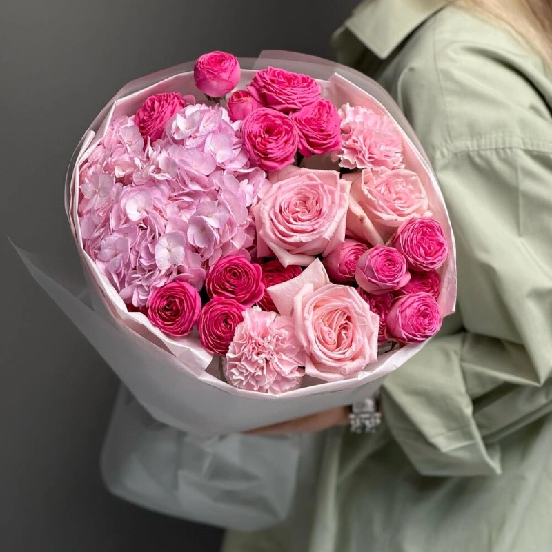Очень яркий и воздушный букет из гортензий и премиальных роз