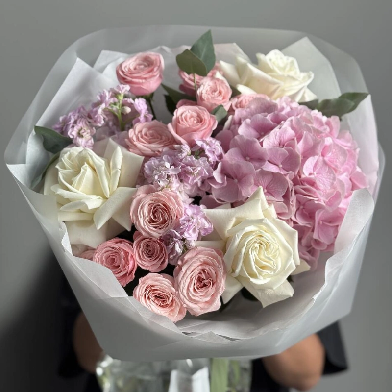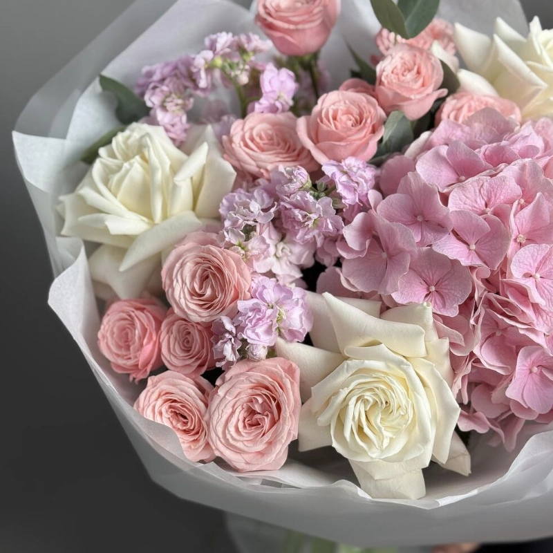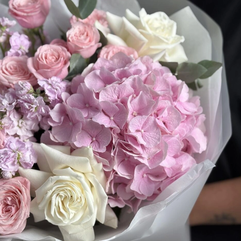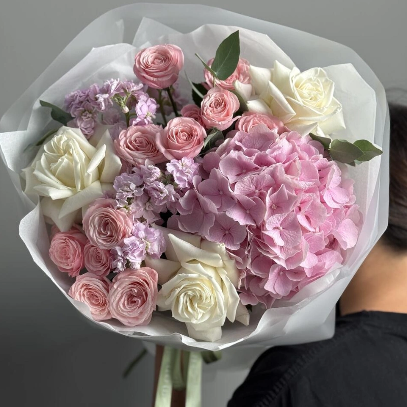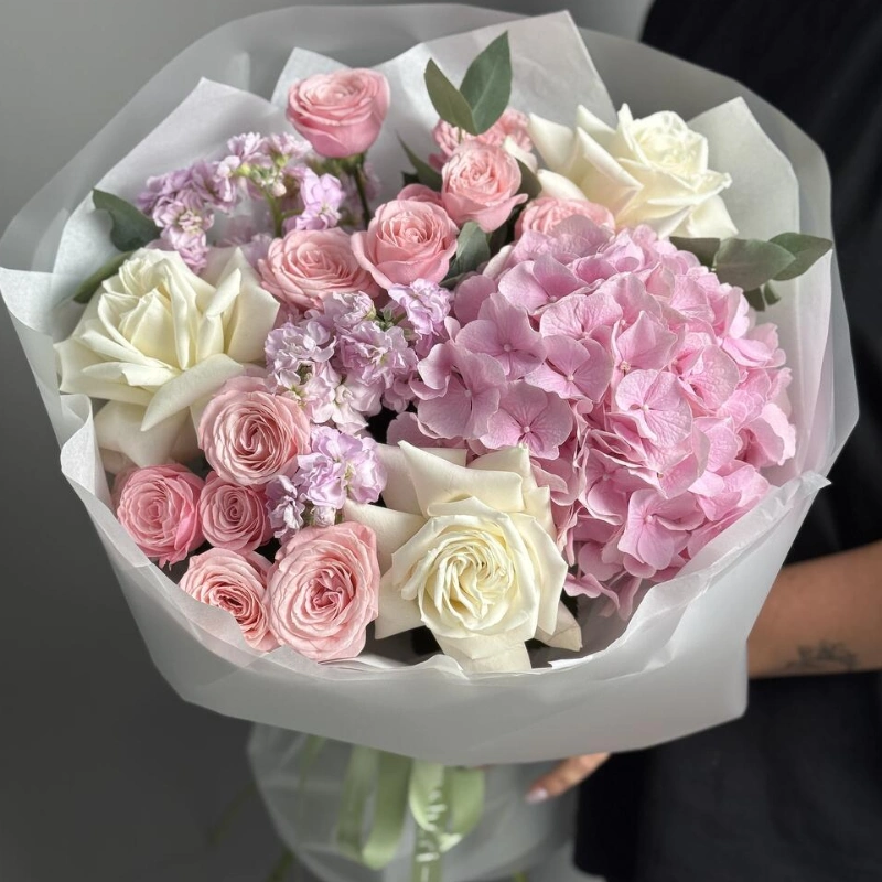ГлавнаяКаталогБукетыБукет «Miu» с кустовыми розами и гортензией