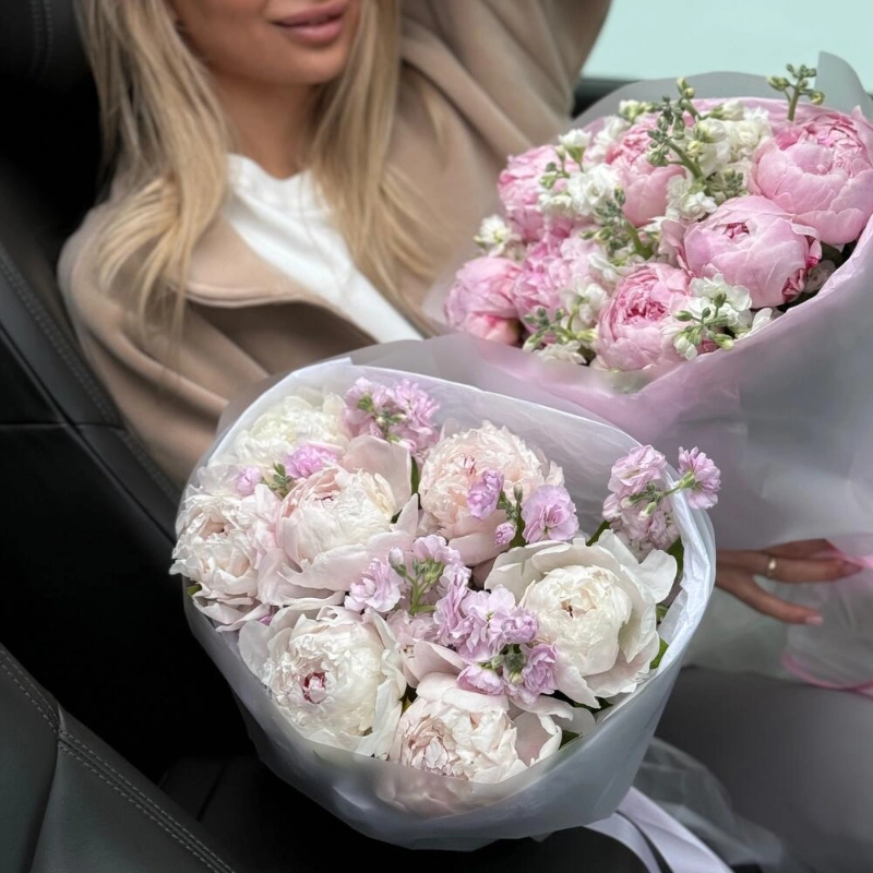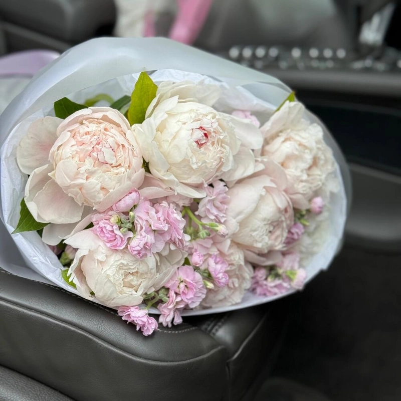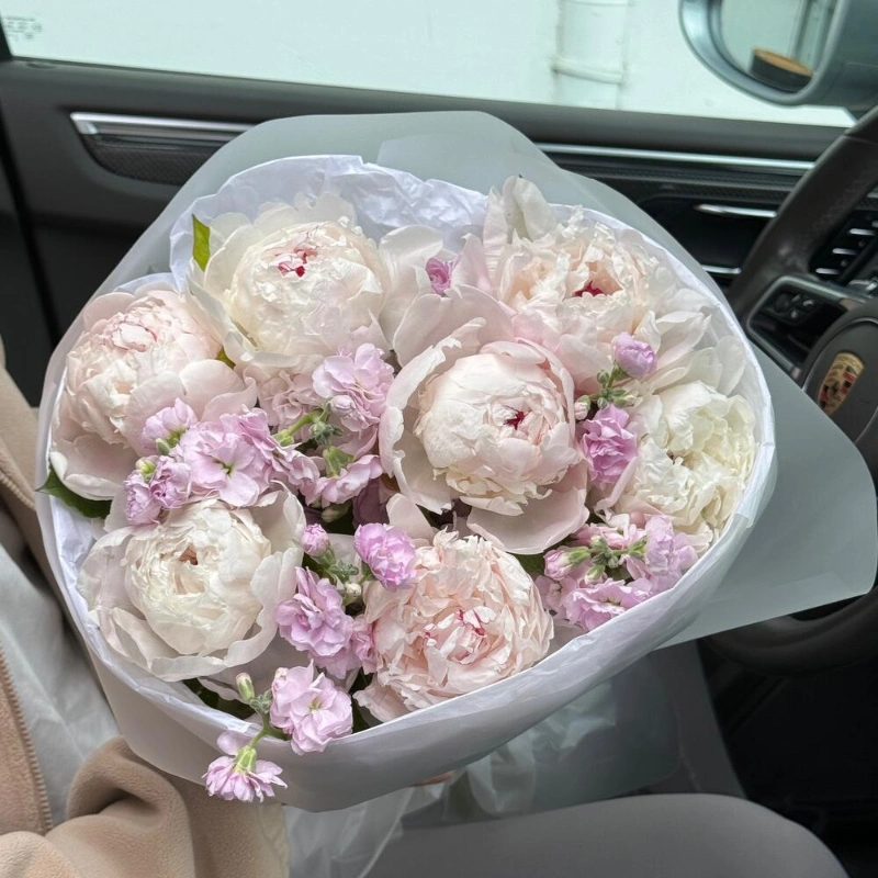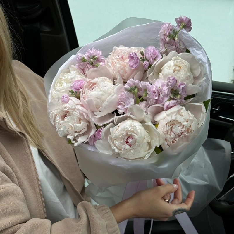ГлавнаяКаталогБукетыБелые пионы и маттиола